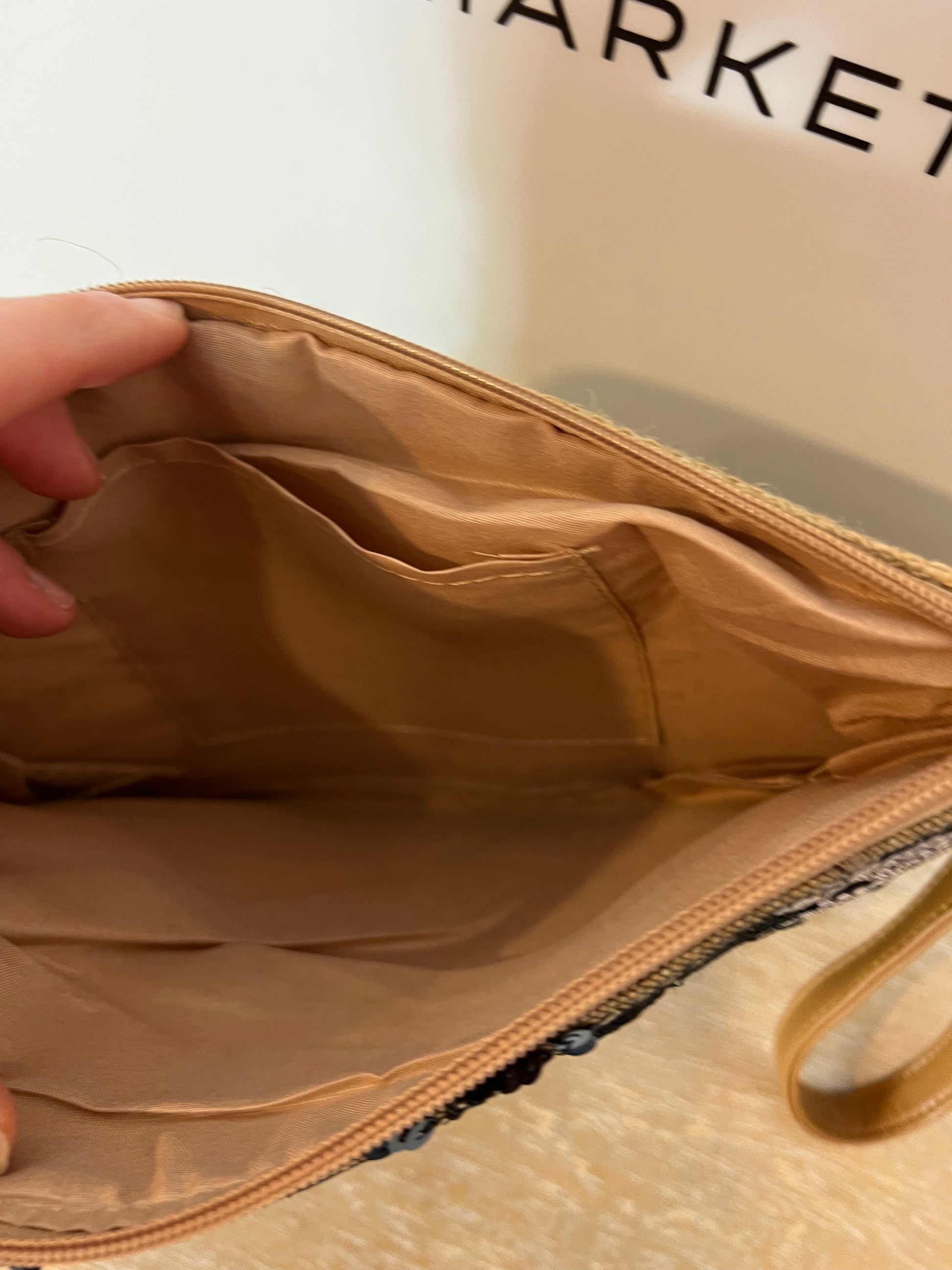 NUEVO CON ETIQUET. Bolso de rafia con parte delantera de rejilla con flores y lentejuelas. Asa de cadena y asa corta efecto piel.