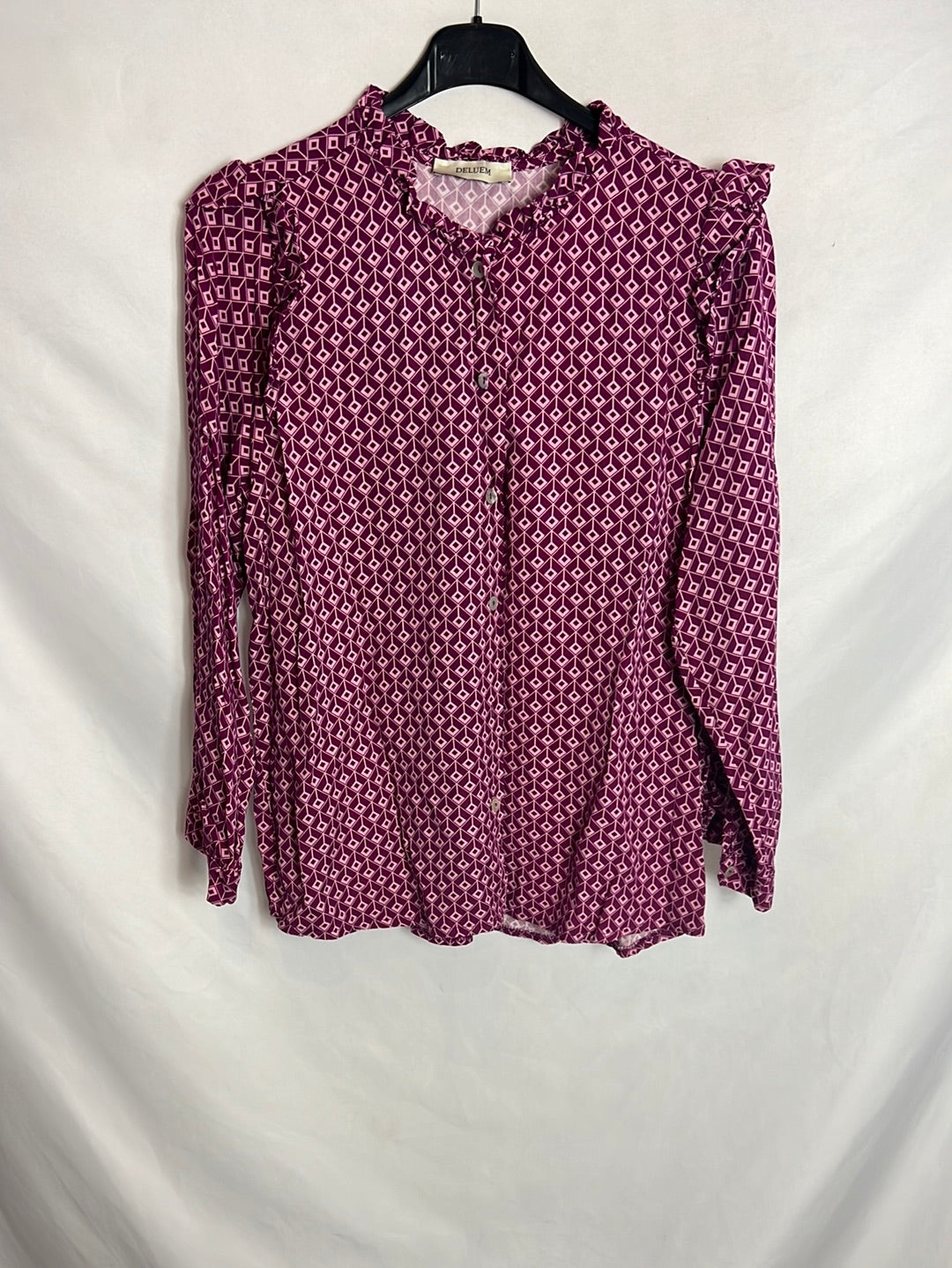 Total look: burgundy blouse and pants. Blouse length: 62 cm, elastic waist: 32 cm, pants length: 102 cm.