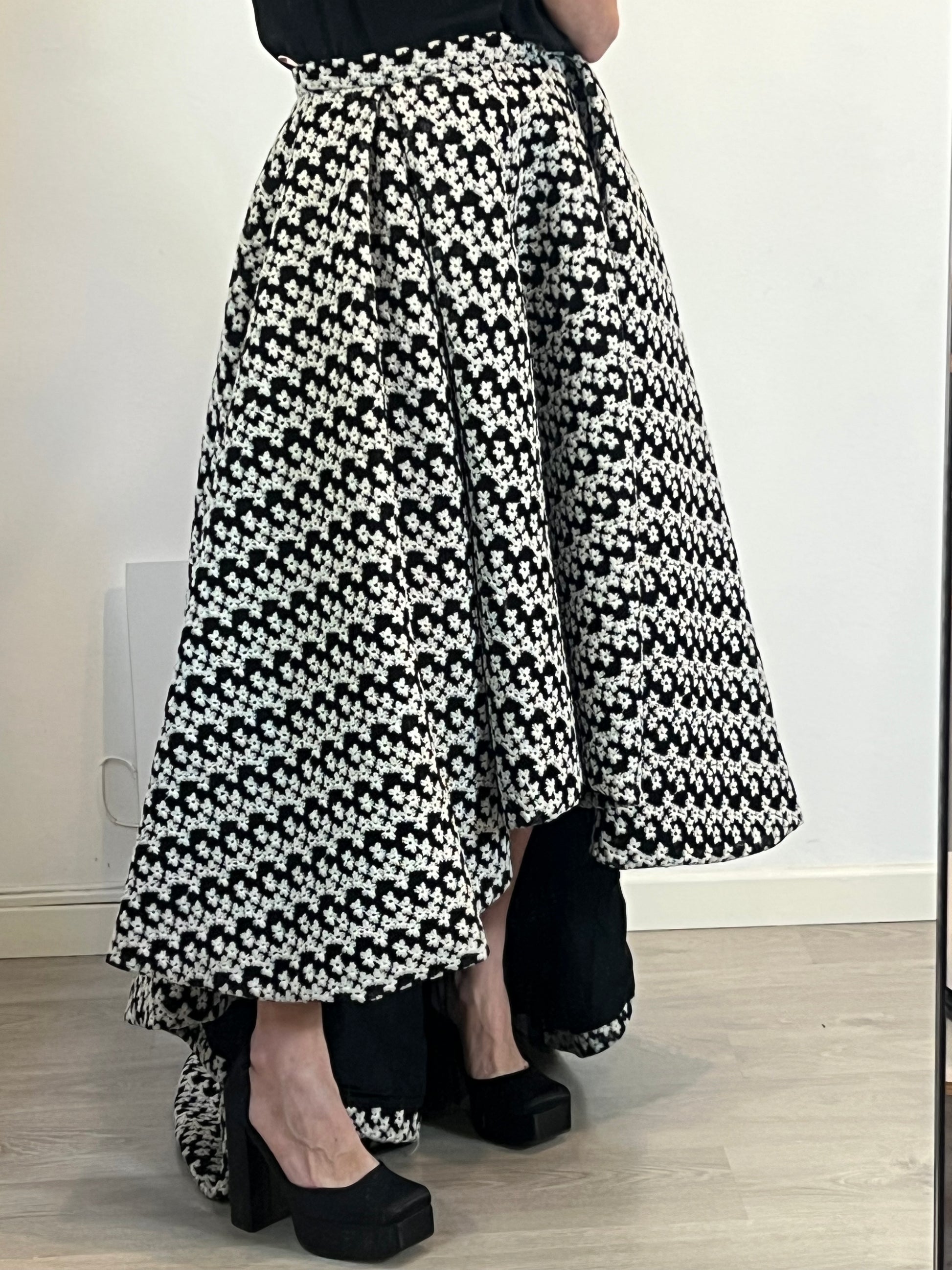 Skirt, party, mesh flare with embroidered flowers, asymmetrical length, non-elastic waist 40 cm long at the front 71 cm at the back 123 cm