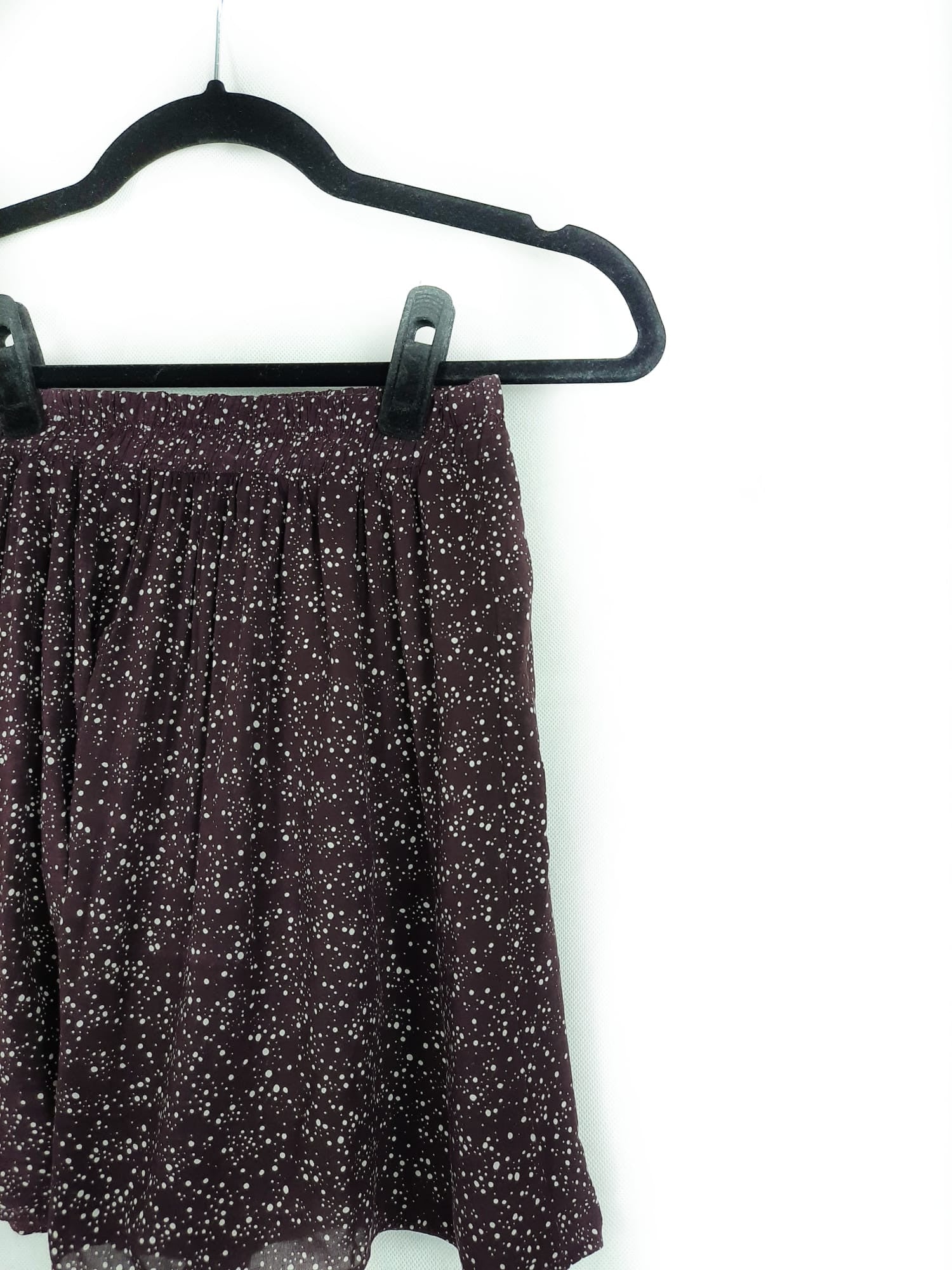 Flowing burgundy skirt with white polka dots. Very short and with an elastic waist. 44 cm long.