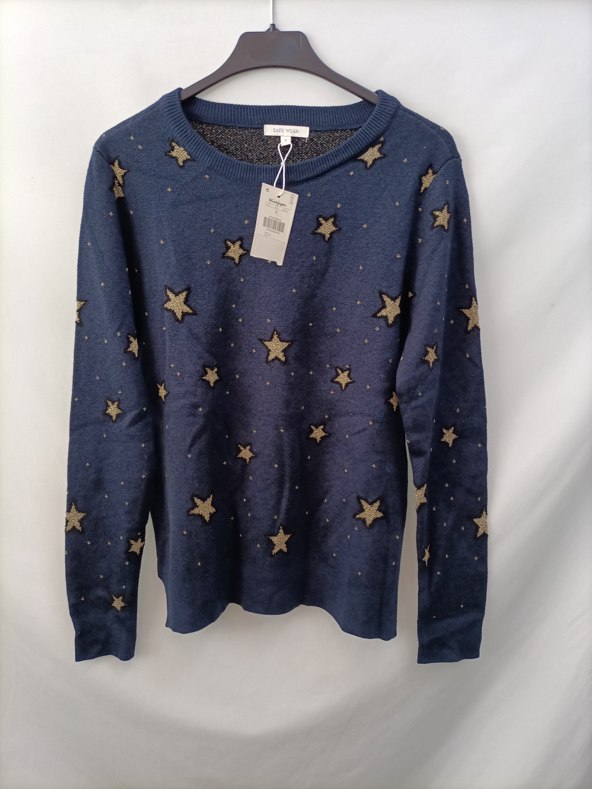 NEW WITH TAG. Navy blue sweater with gold stars. Length 63 cm.