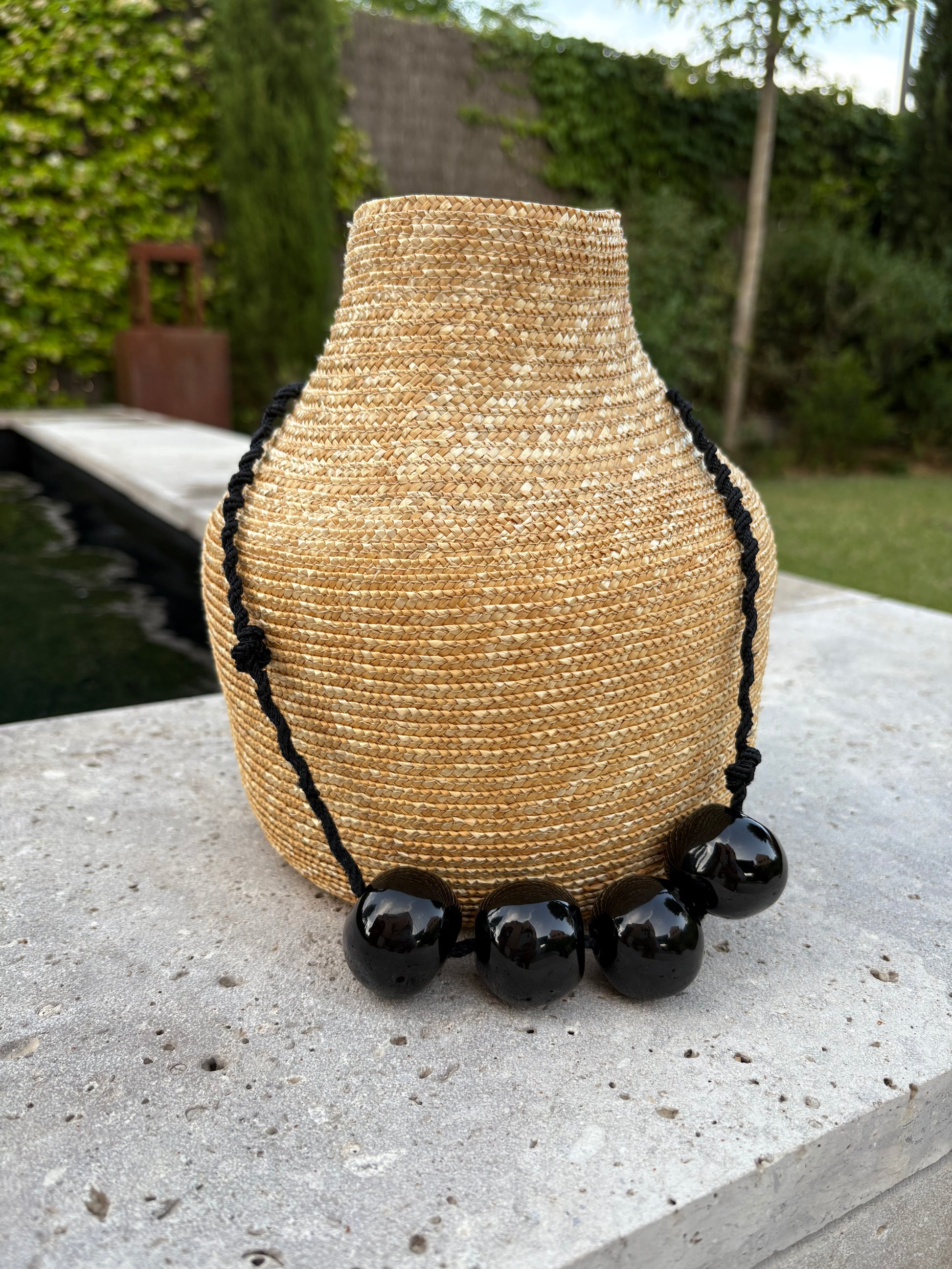 Handmade vase-shaped bag made of rigid black balls. Height 22 cm, depth 19 cm.
