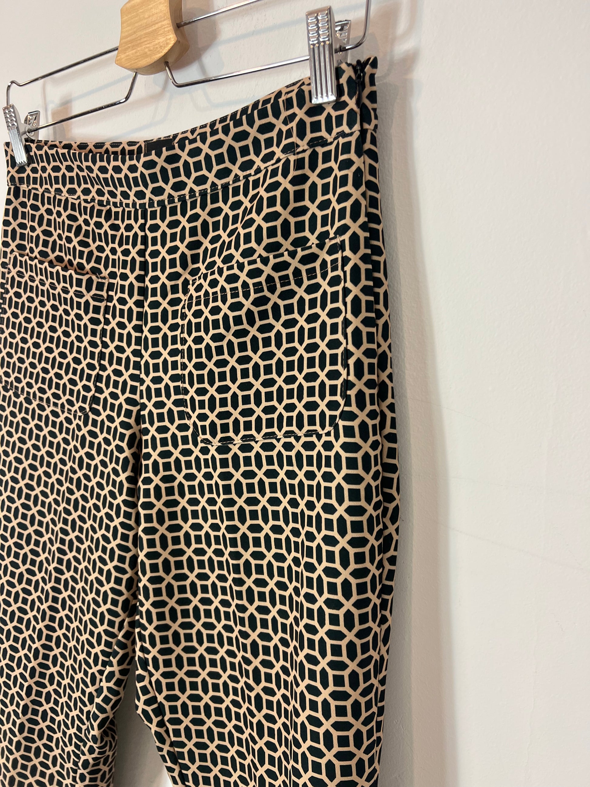 Black trousers with beige geometric print, fitted with a bell bottom. Waist 37, length 96cm