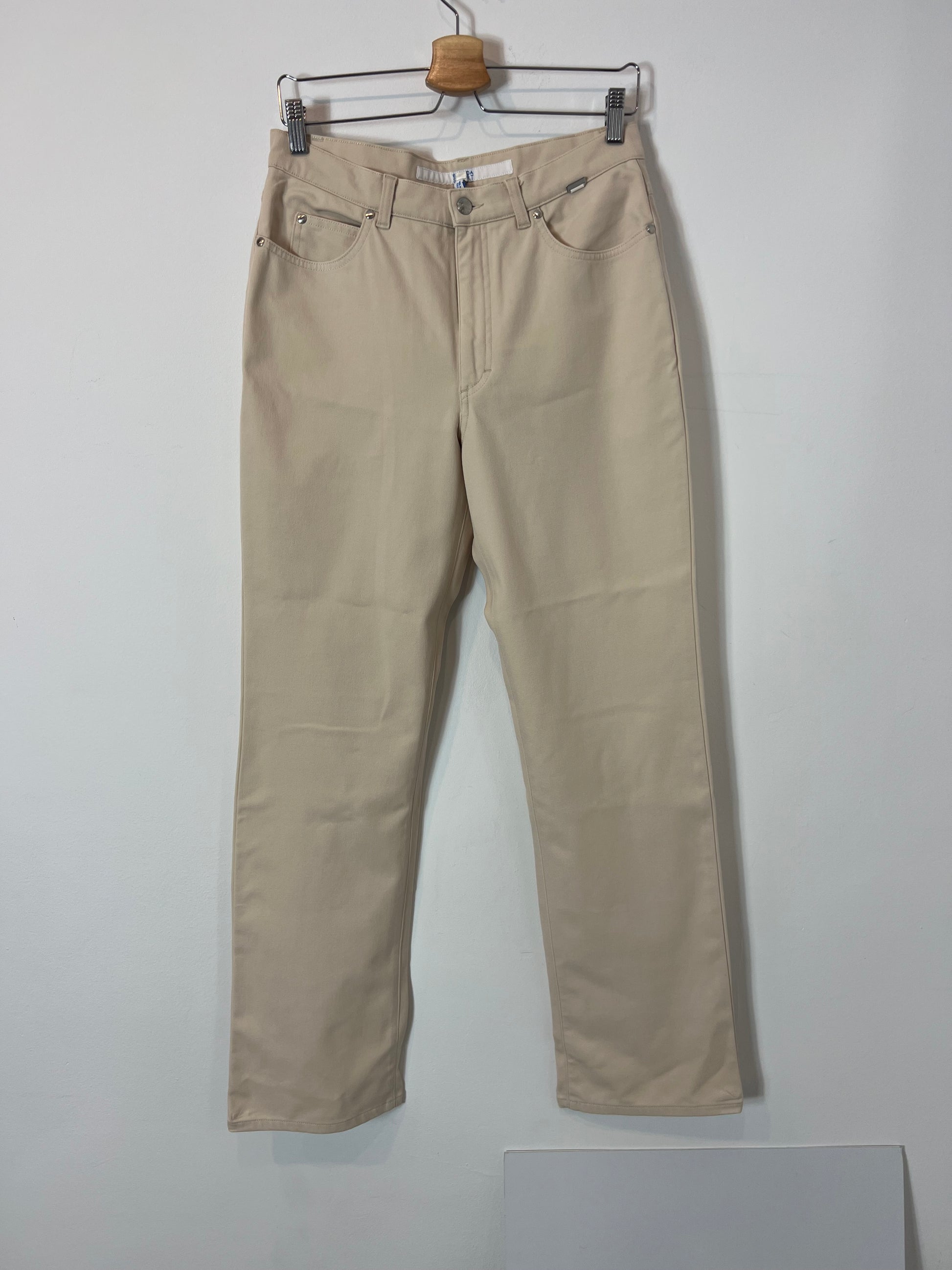 Beige semi-stretch denim straight-leg trousers. Waist 38 cm, length 110 cm.