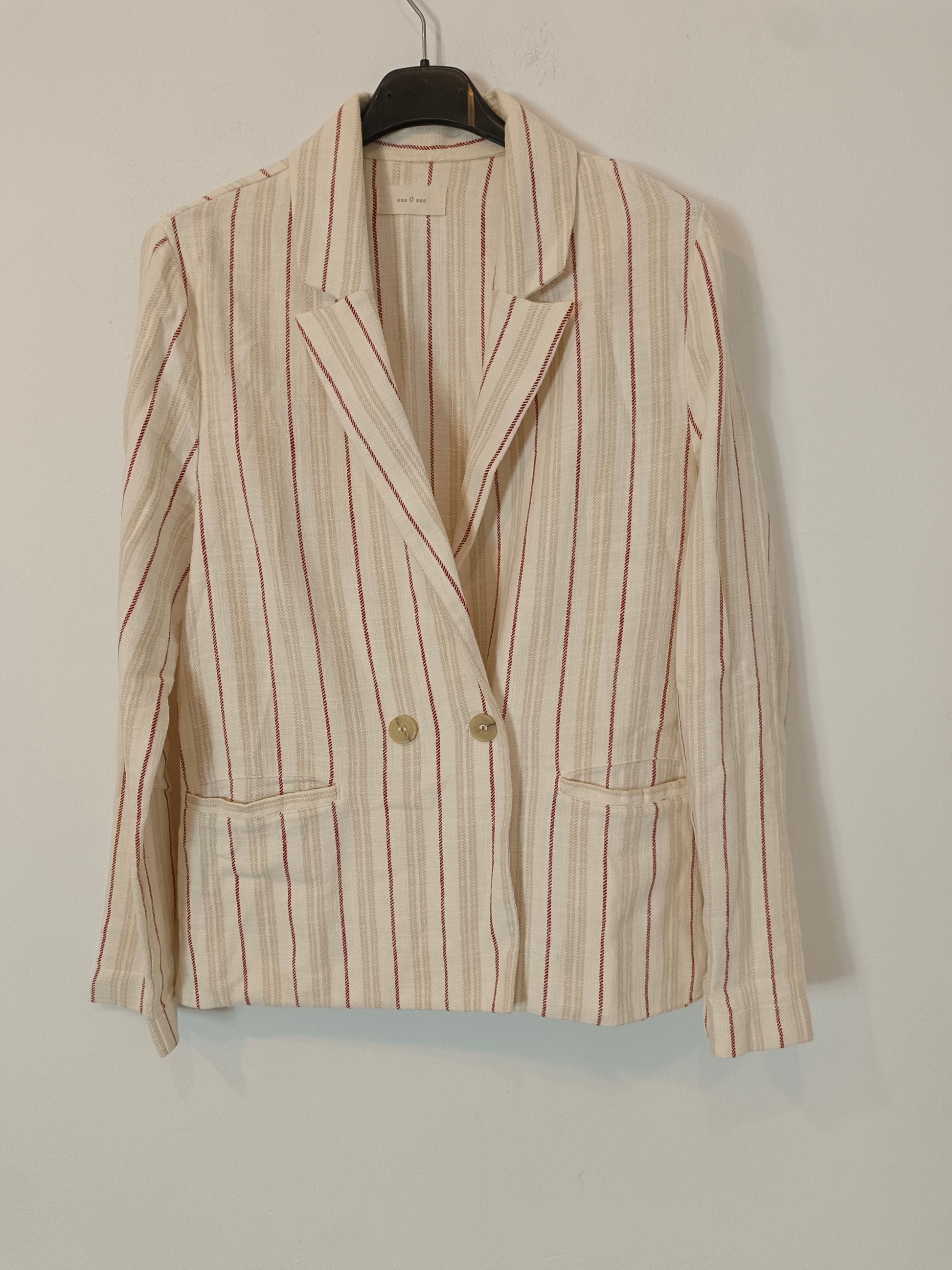 Beige flowing blazer with camel and burgundy stripes made of cotton. 50 cm from armhole to armhole, 58 cm long.
