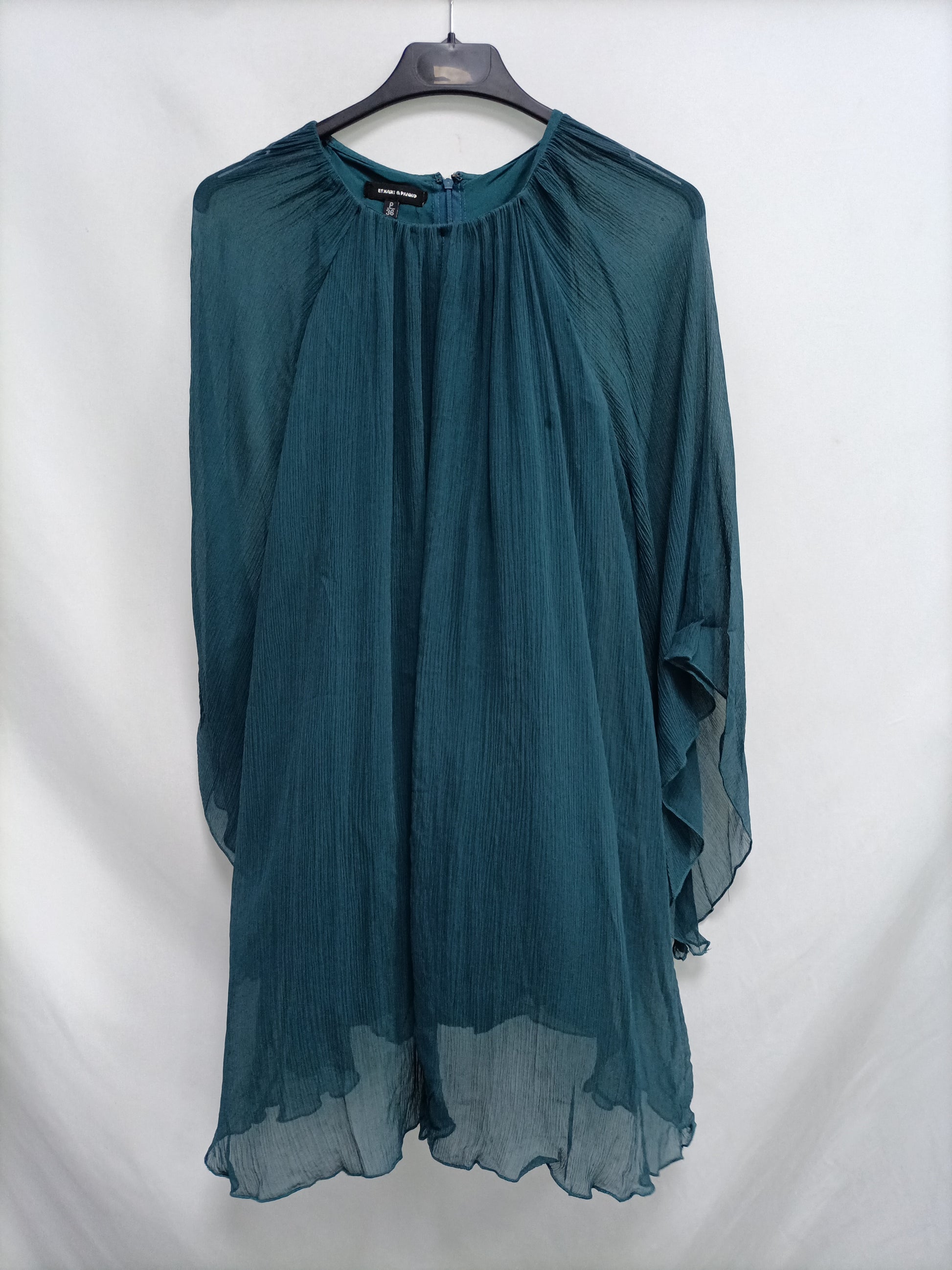 vestido muy cortito verde de tejido plisado con las mangas efecto capa. no elástico. de sisa a sisa 42 cm largo 72 cm