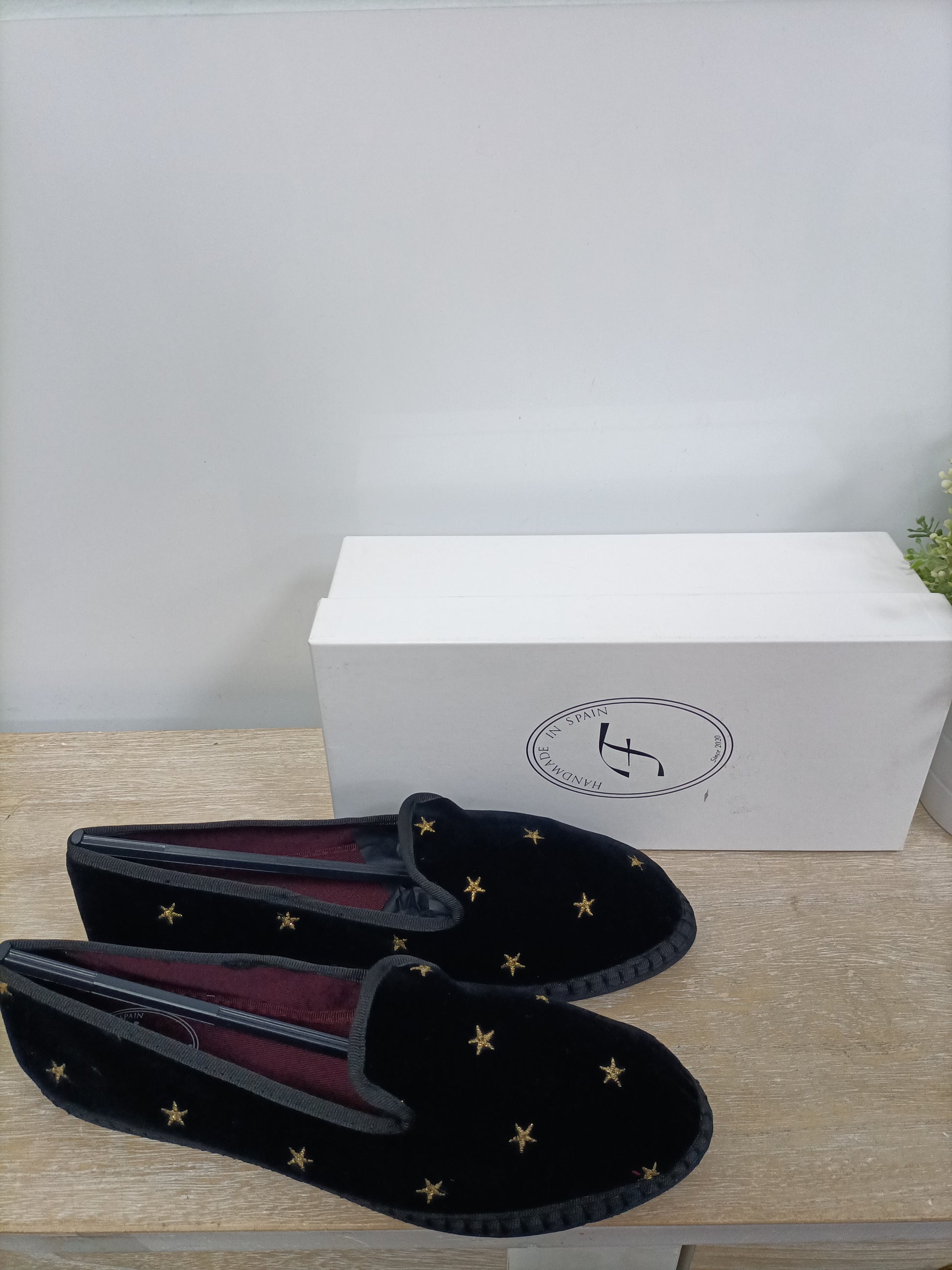 Black velvet moccasins (slippers) handmade with embroidered gold stars.