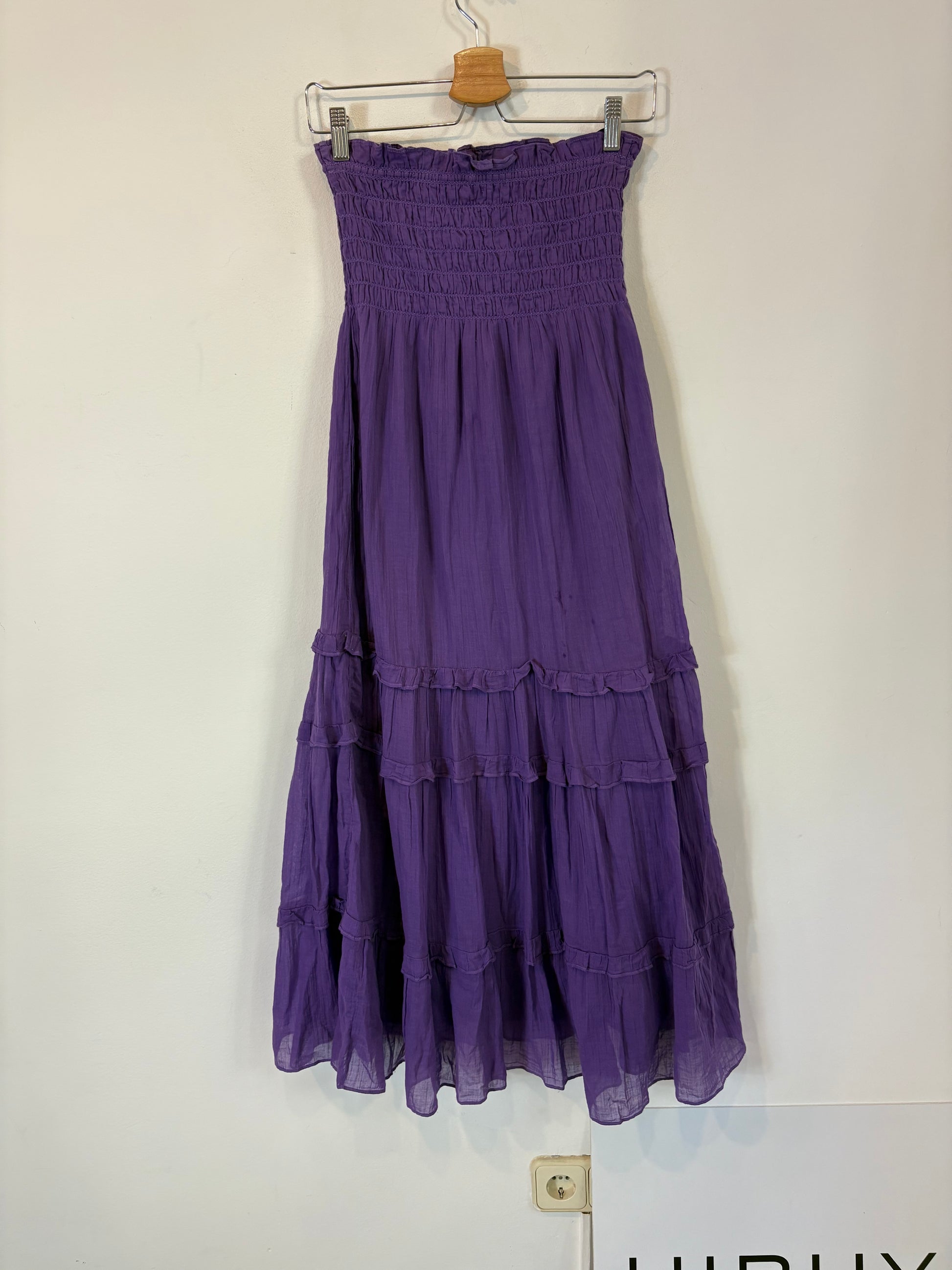 Long purple dress with a strapless smocked neckline. 112 cm long.