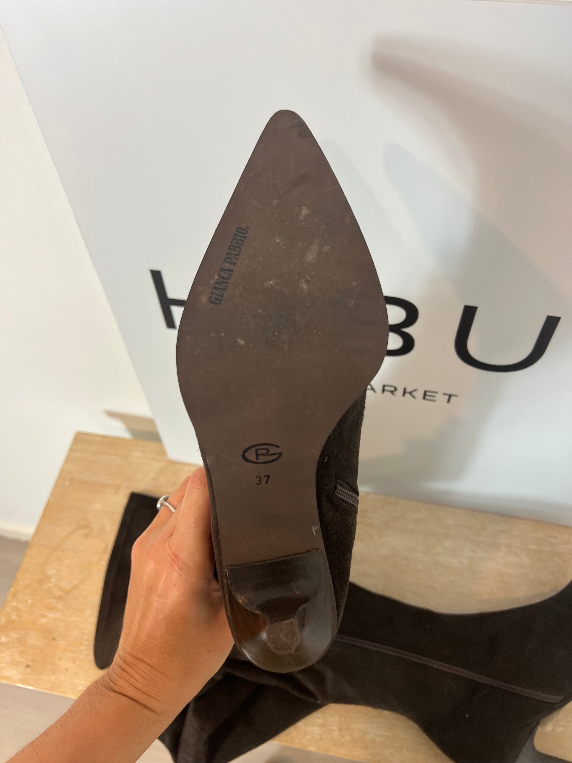 Brown knee-high boots with a pointed toe. 53cm heel length, semi-elastic, 8.5cm heel height.