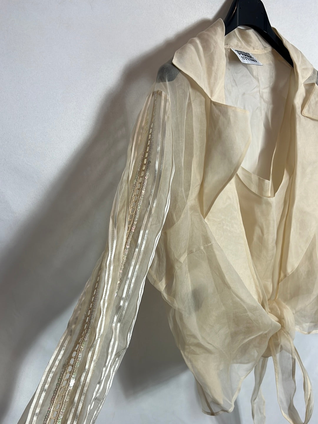 Silk top and semi-sheer jacket set in tan. Top from armpit to armpit 49 cm, length 48 cm.
