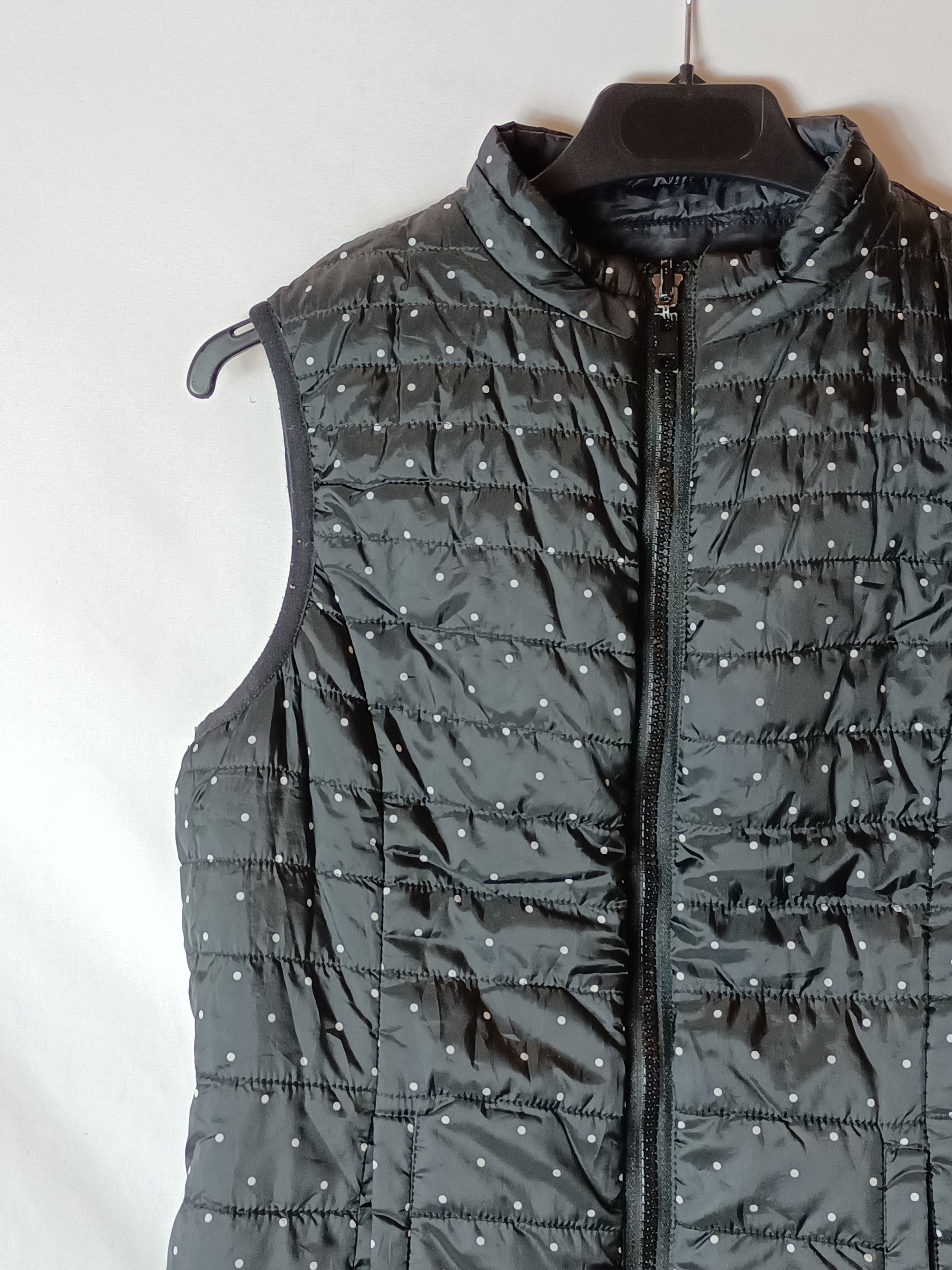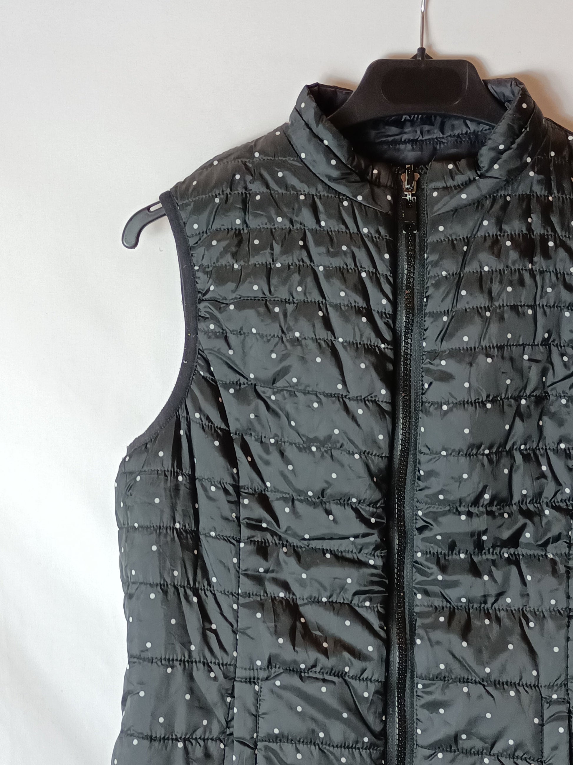 lightweight sleeveless down jacket, reversible black and black polka dots.