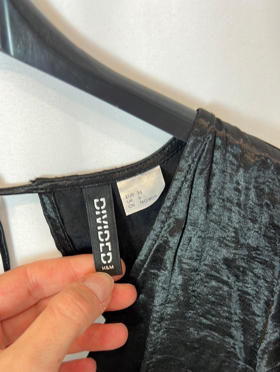Flowy black satin midi dress. Waist 34cm, length 122cm, non-stretchy.