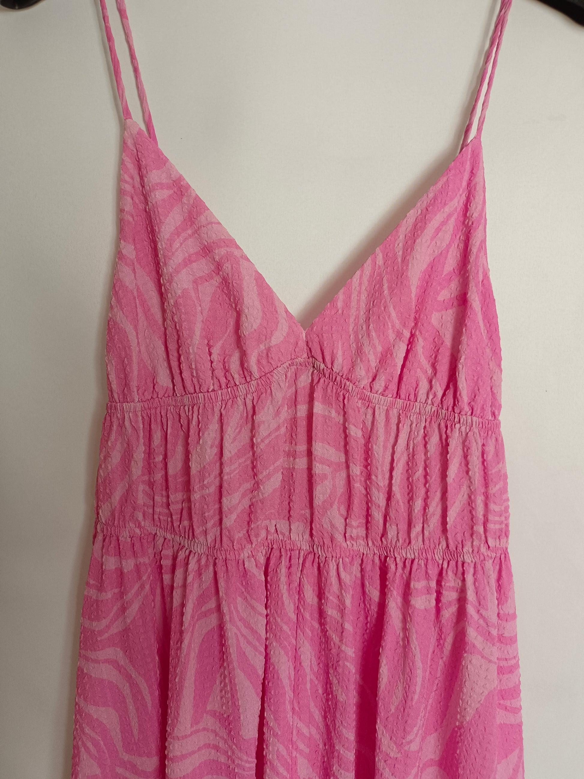 Long pink striped dress with textured fabric and adjustable straps. Elastic under the bust.