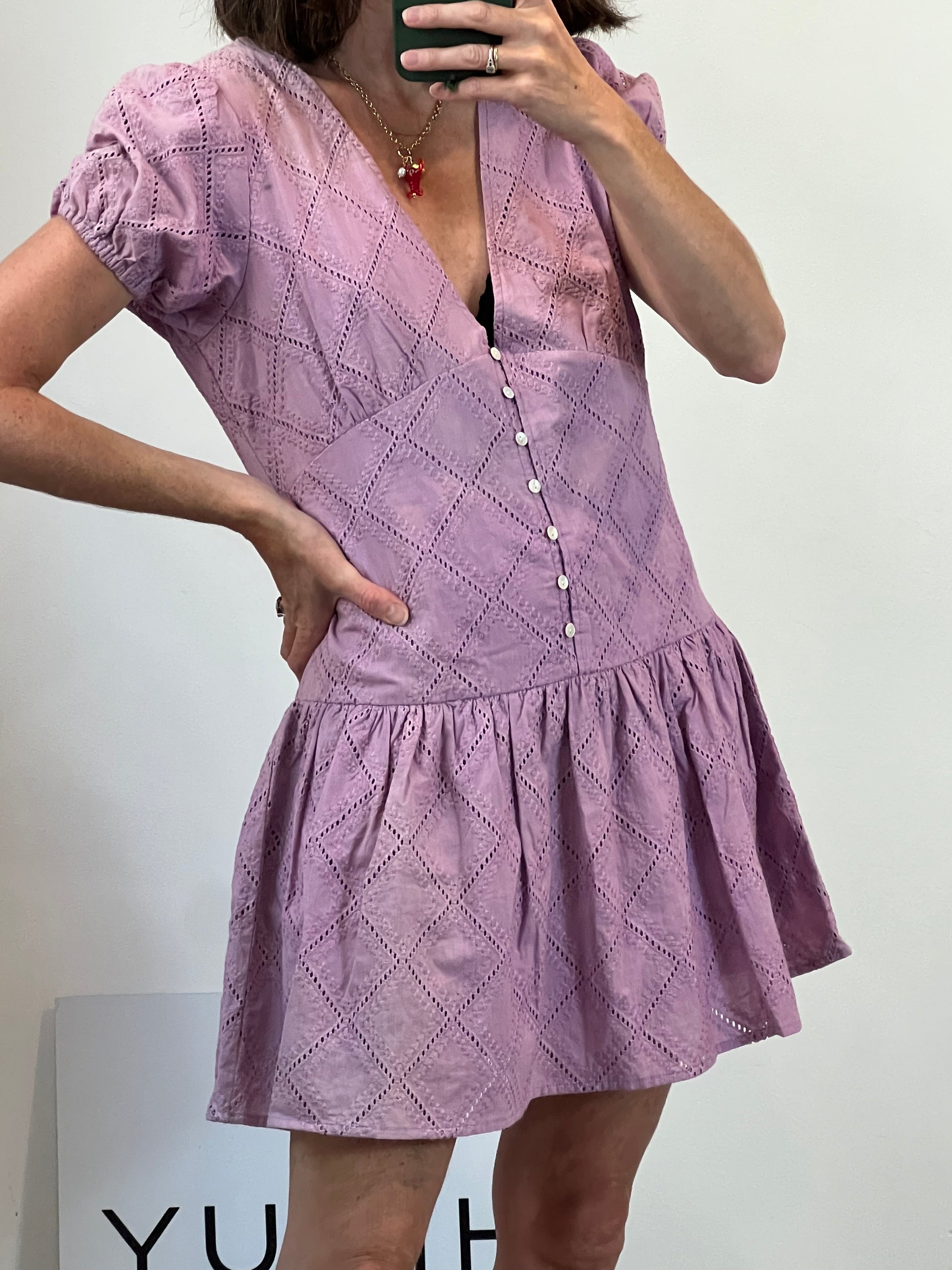 Short mauve buttoned dress with die-cut details. 52 cm from armhole to armhole, 83 cm long.