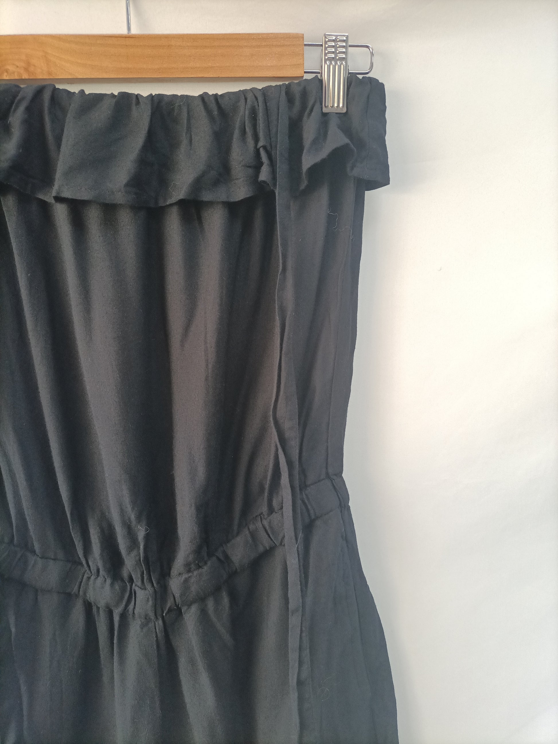 Black jumpsuit with a ruffle at the neckline, ties at the neck and adjusts at the waist with elastic.
