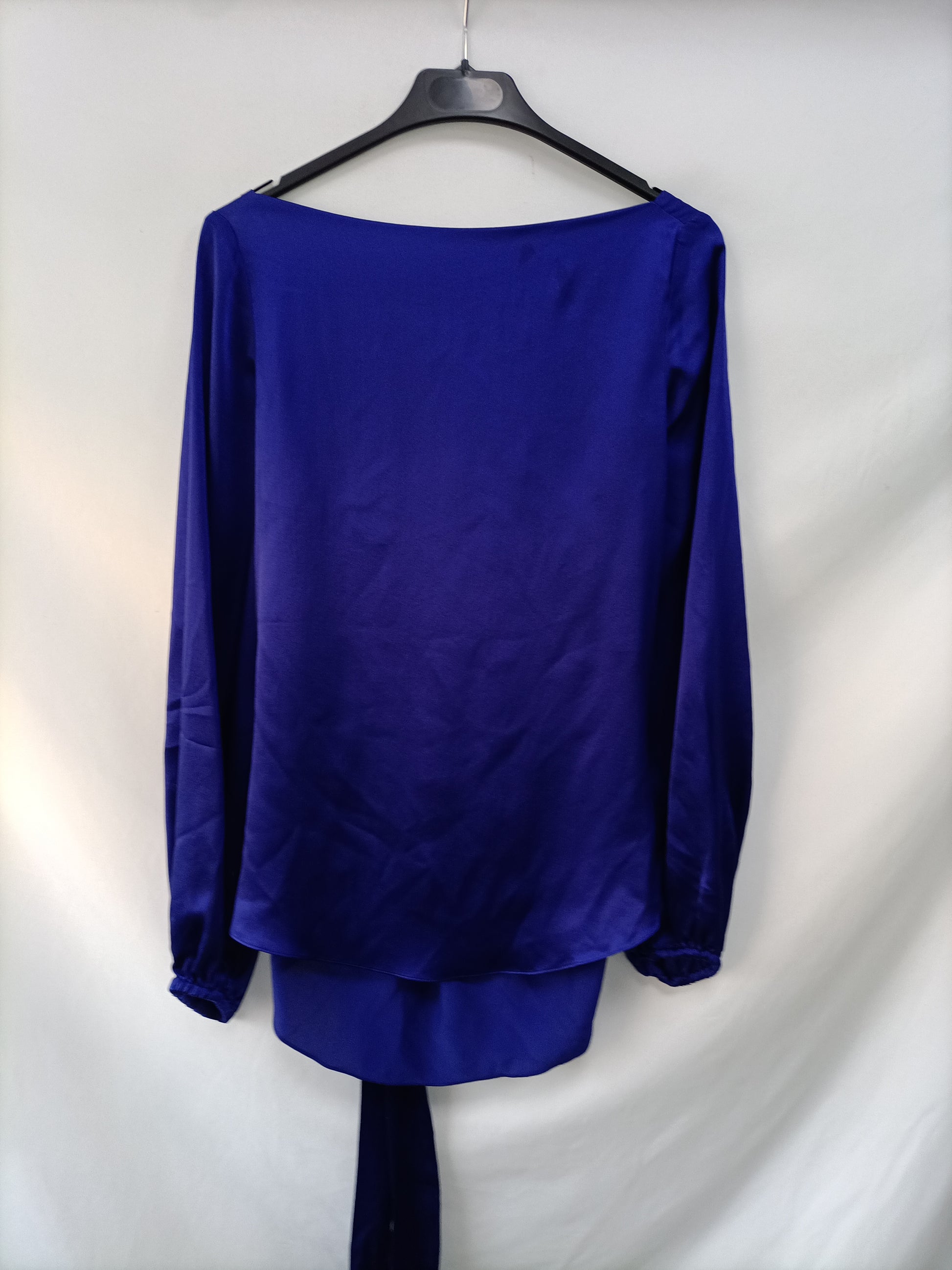 Intropia. Flowy purple satin blouse with an open back and a bow. Non-stretchy. 37 cm from armhole to armhole, 72 cm long.