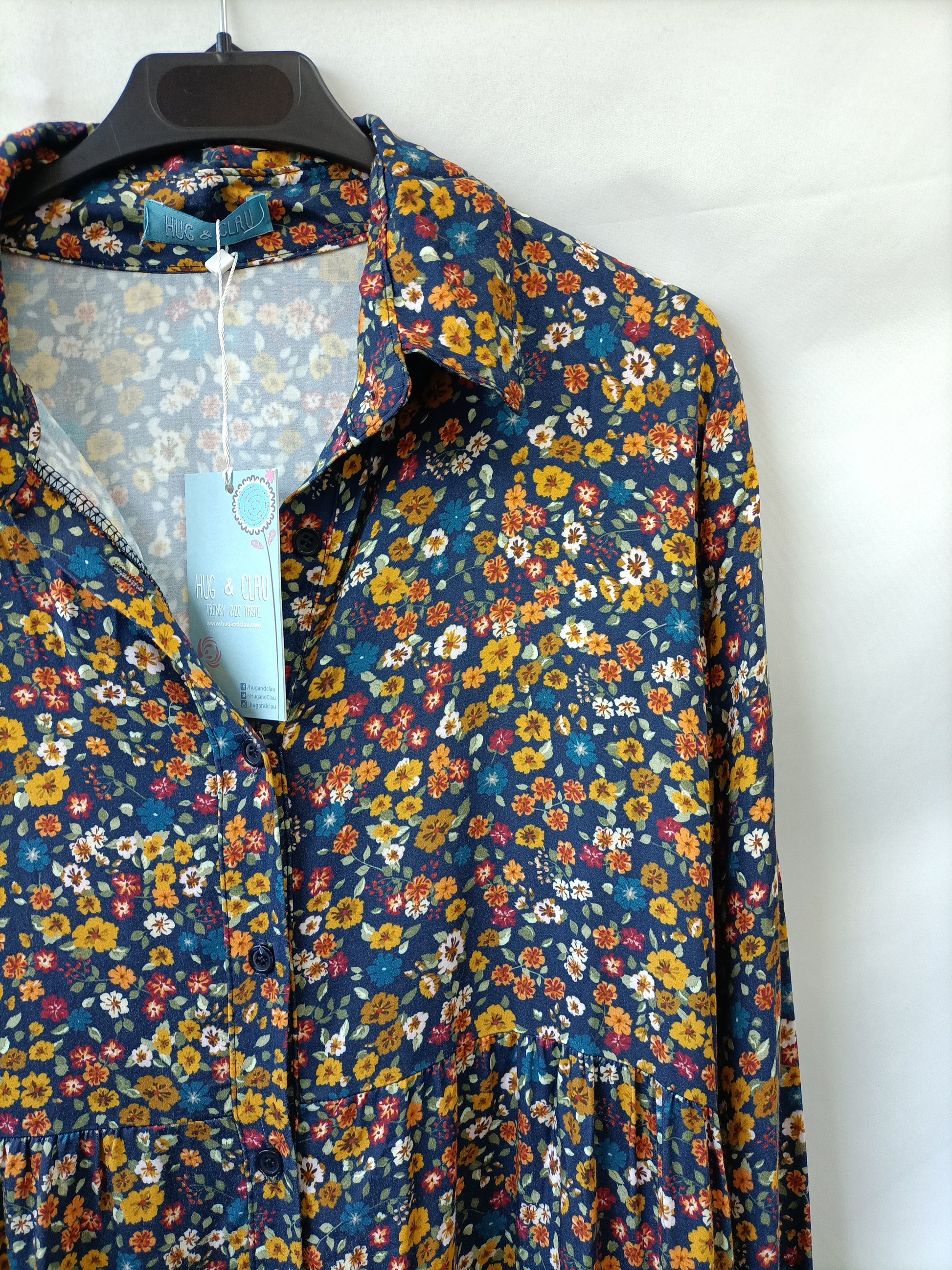 NEW WITH TAG. Button-down floral shirt dress. Mini ruffle at the sleeves. Flowy and stretchy. 53 cm from armhole to armhole, 91 cm long.