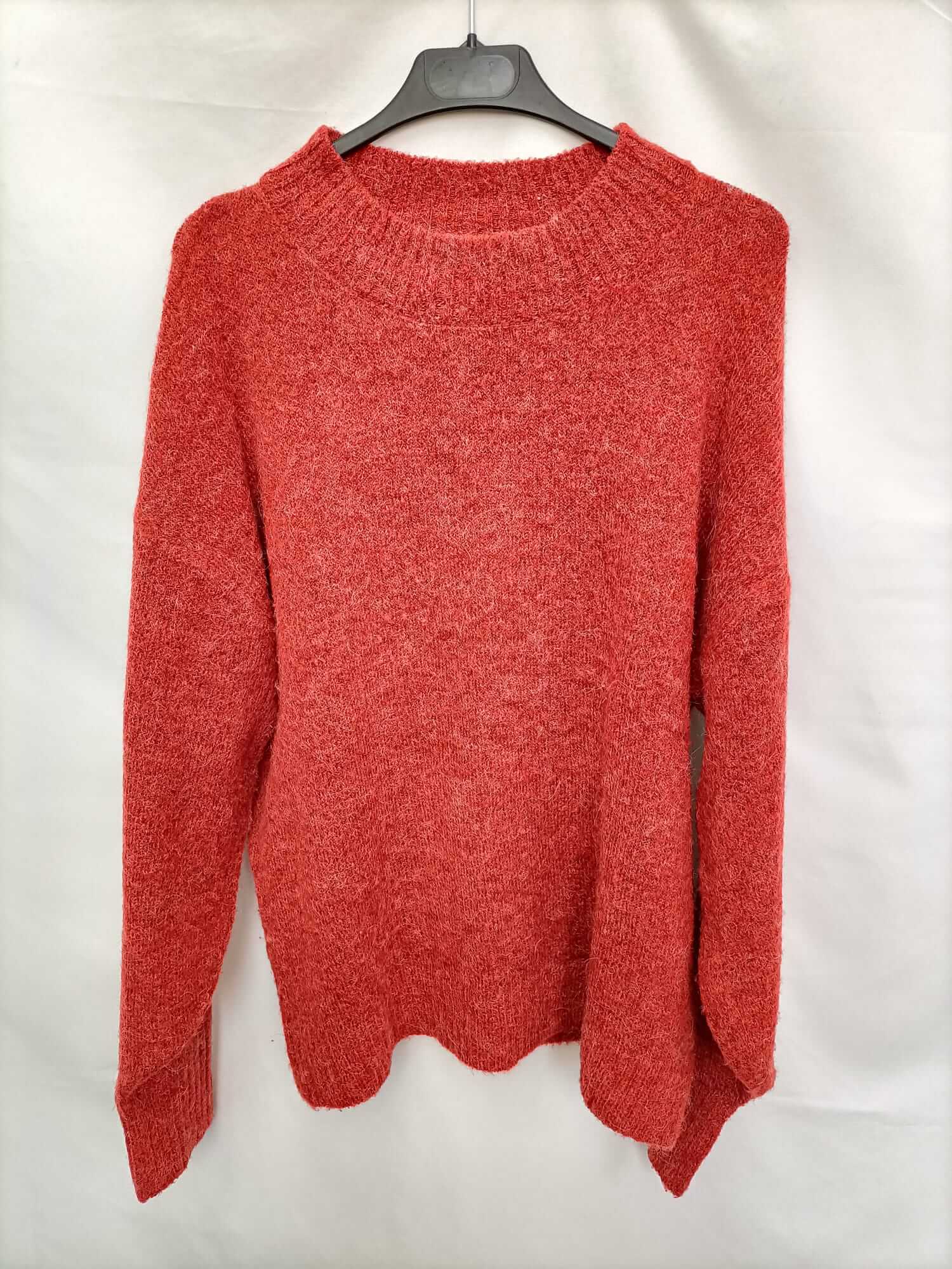 Ichi.l. Dark orange flowy sweater with white flecks. Crew neck. Flowy and stretchy. 66 cm long.