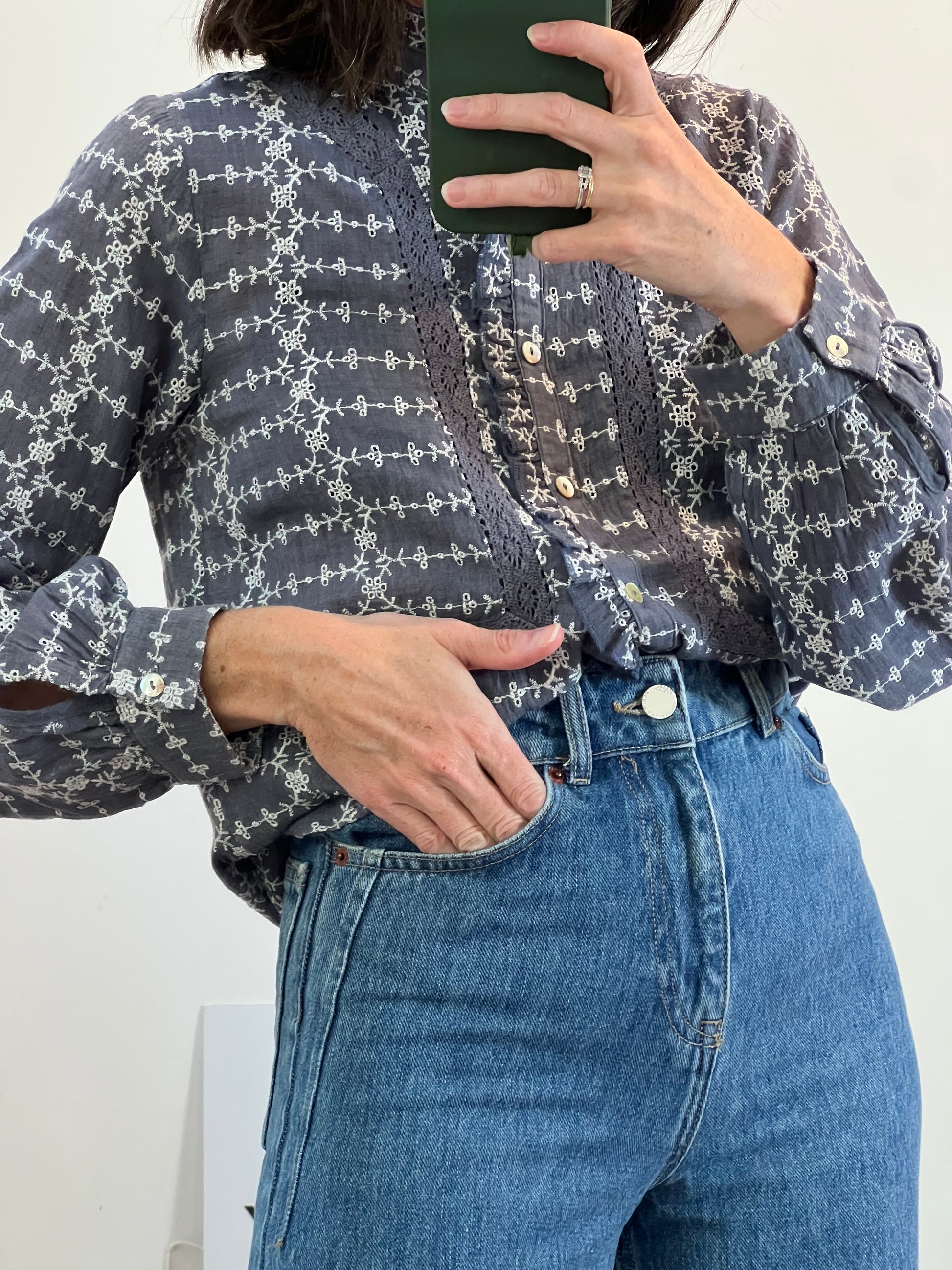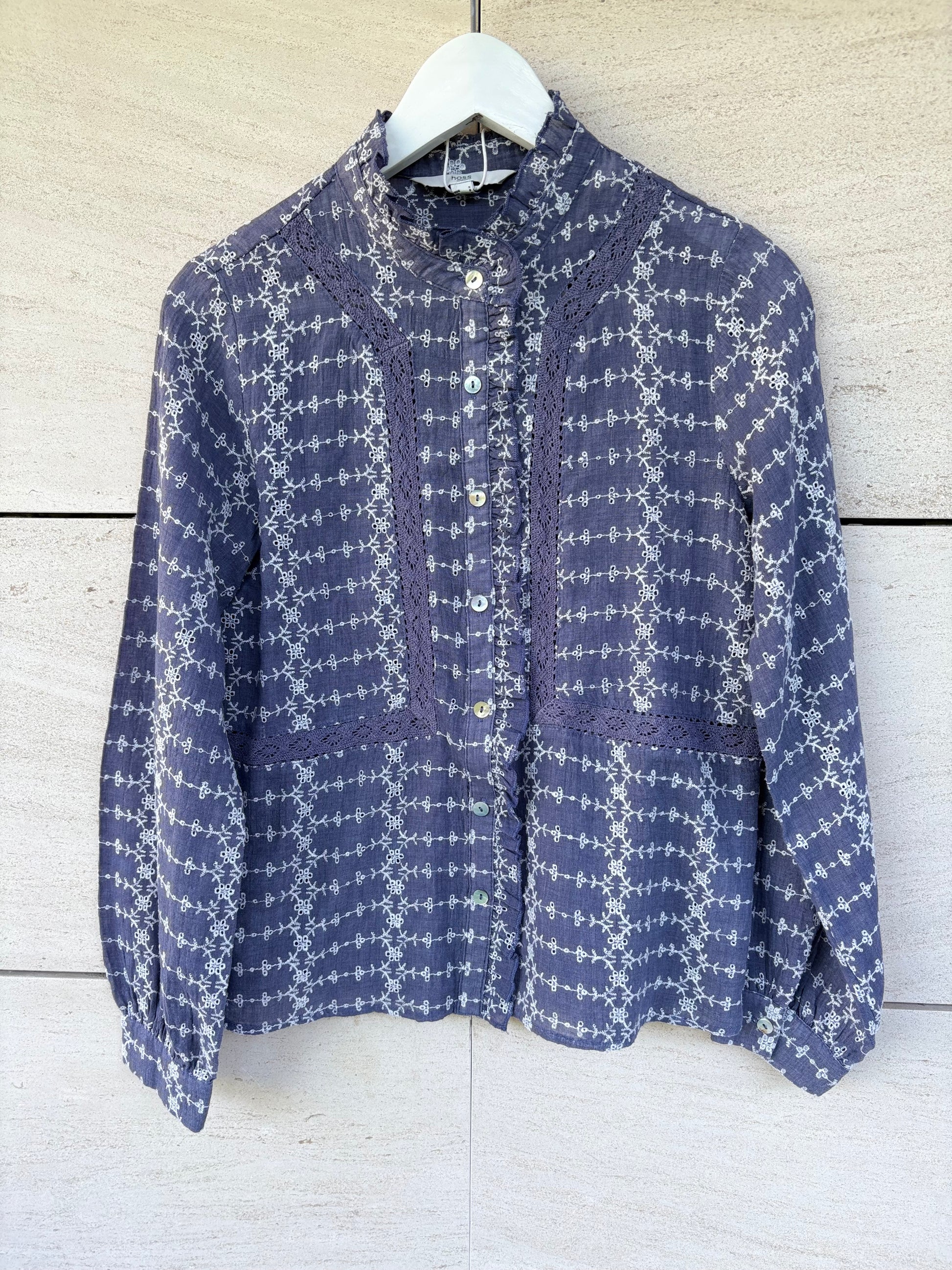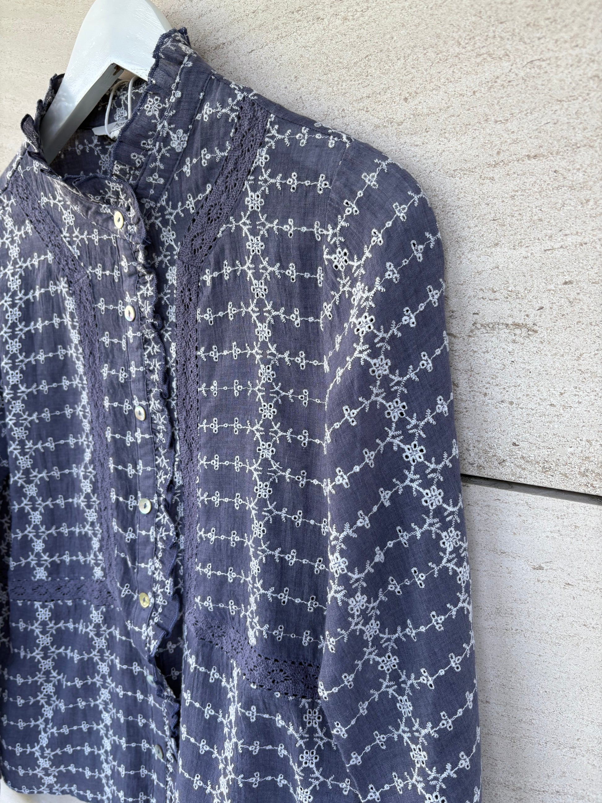 NUEVA SIN USO. Blusa azul efecto denim bordados y encajes. Espalda 46 cm , largo 62 cm