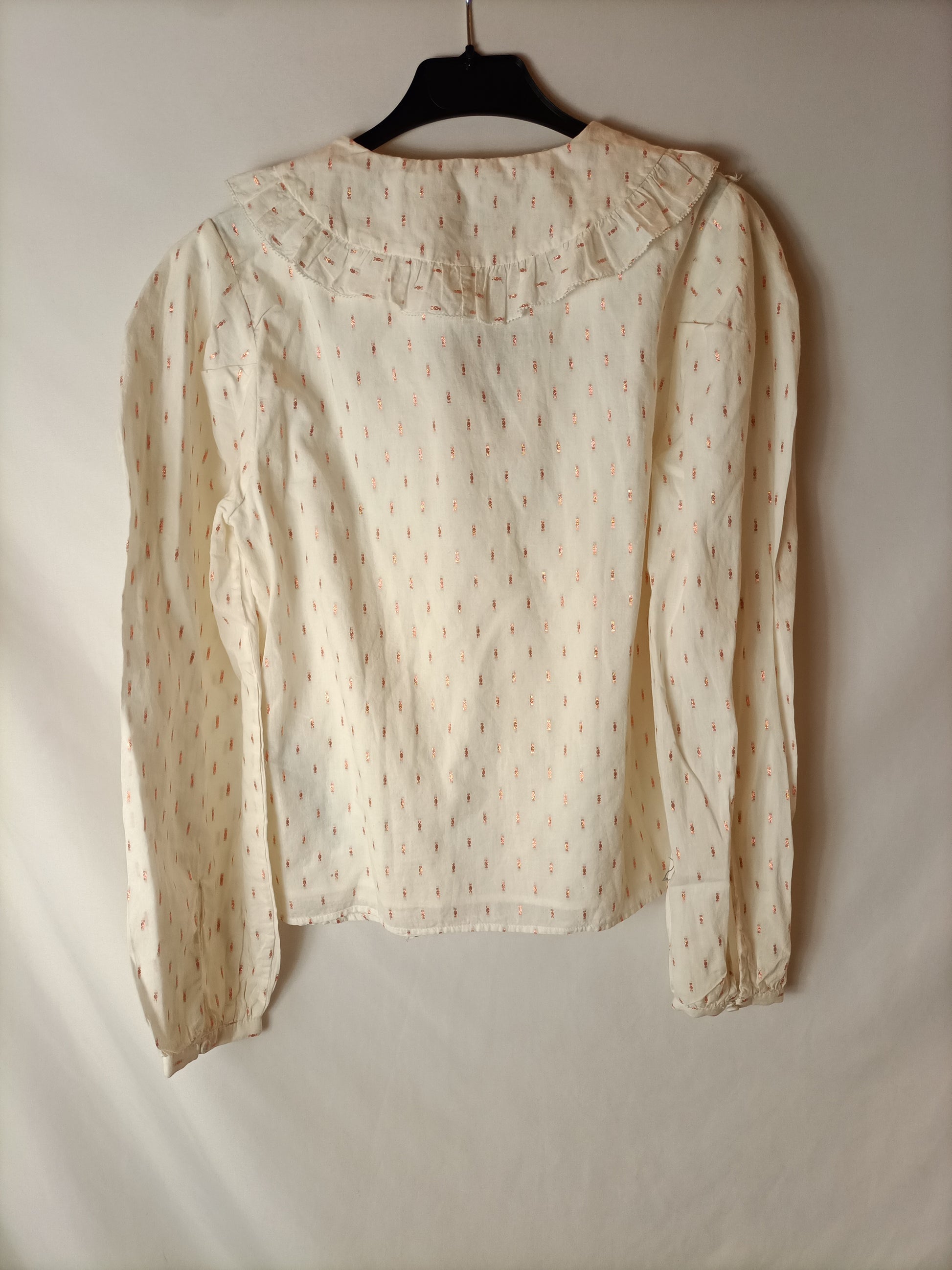 NEW WITH TAG. Off-white blouse with pink metallic thread detailing and ruffles. 44 cm from armhole to armhole, 55 cm long.