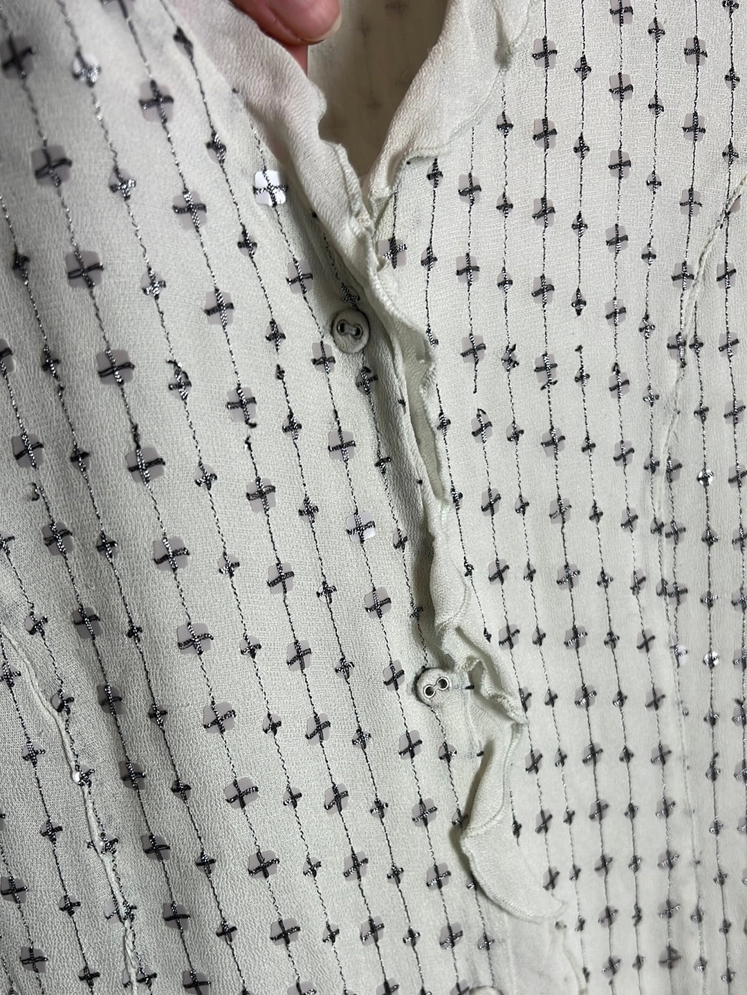 Light gray chiffon and sequin button-down dress. Size 42, shoulders 41 cm, armhole to armhole 46 cm, length 88 cm. 100% viscose. Semi-stretch.