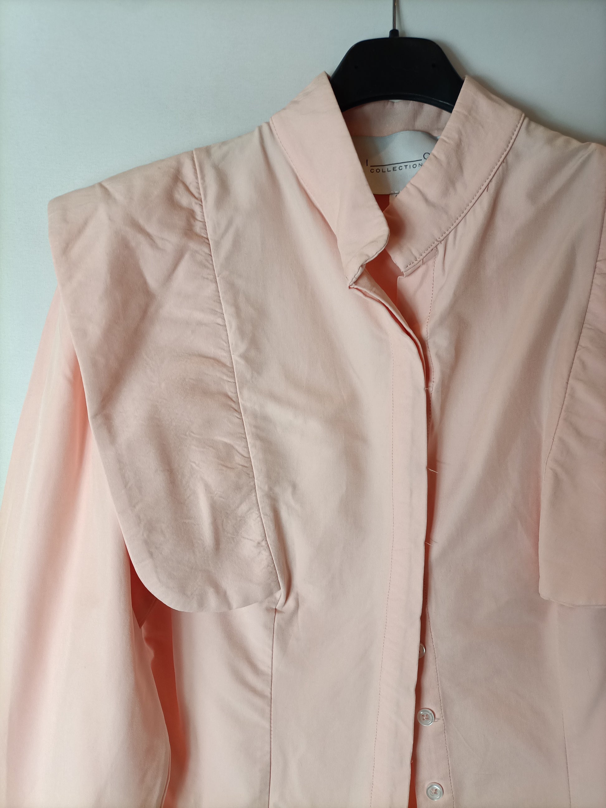 fitted pink blouse with ruffle detail and thin shoulder pads.