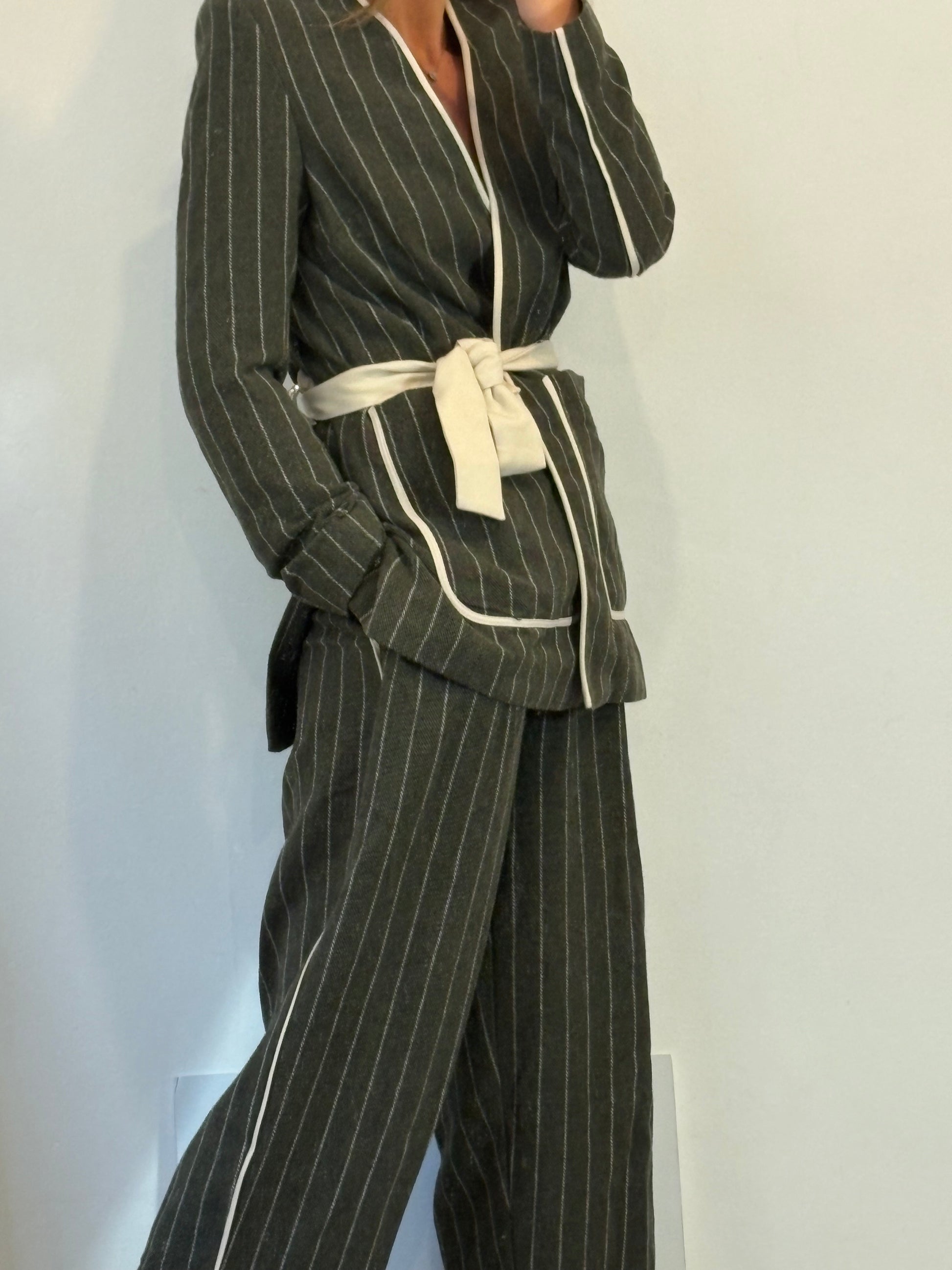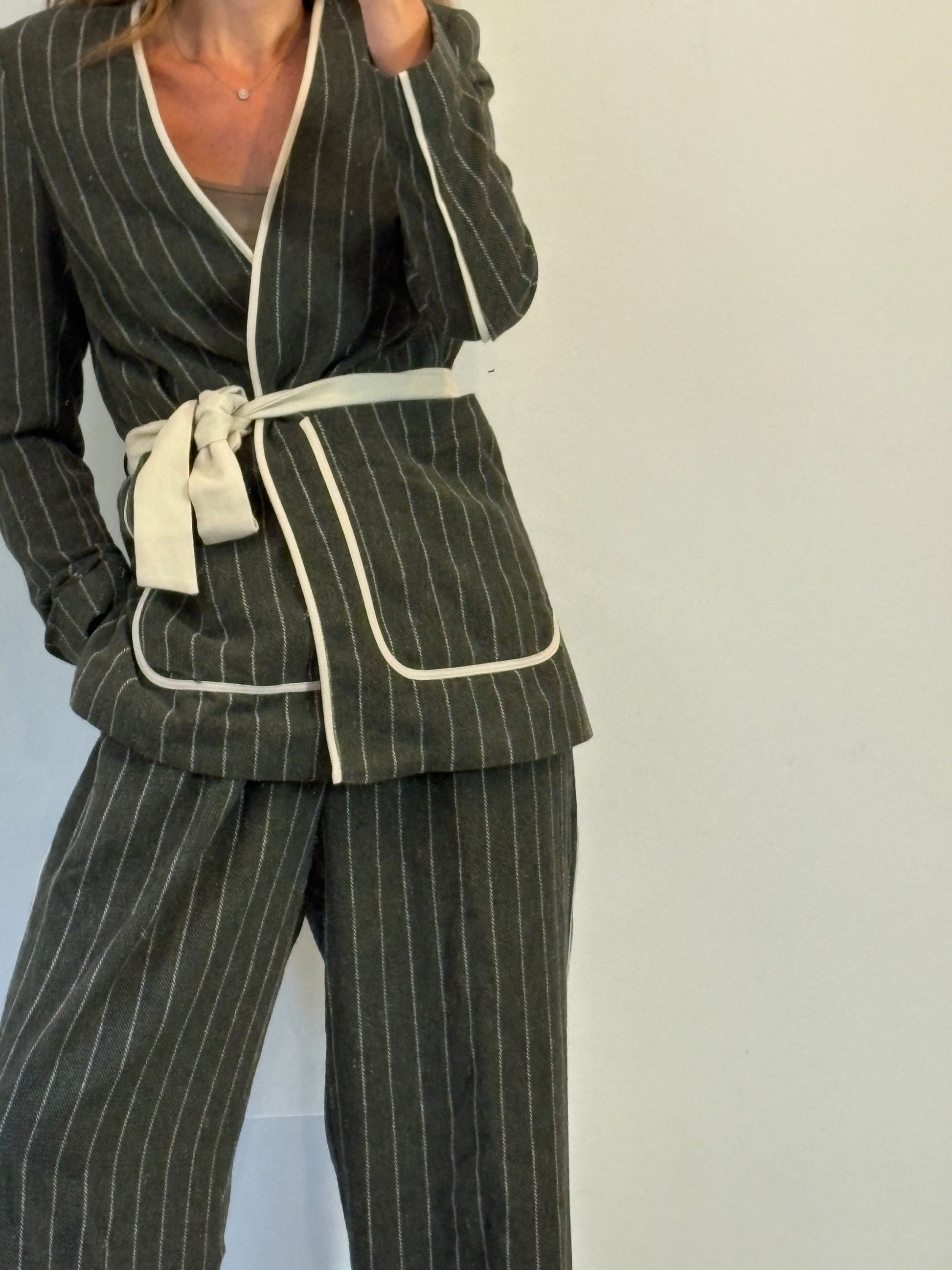 conjunto XL/L. Pantalón cintura 40 cm largo 106 cm. blazer de sisa a sisa 41 cm largo 74 cm