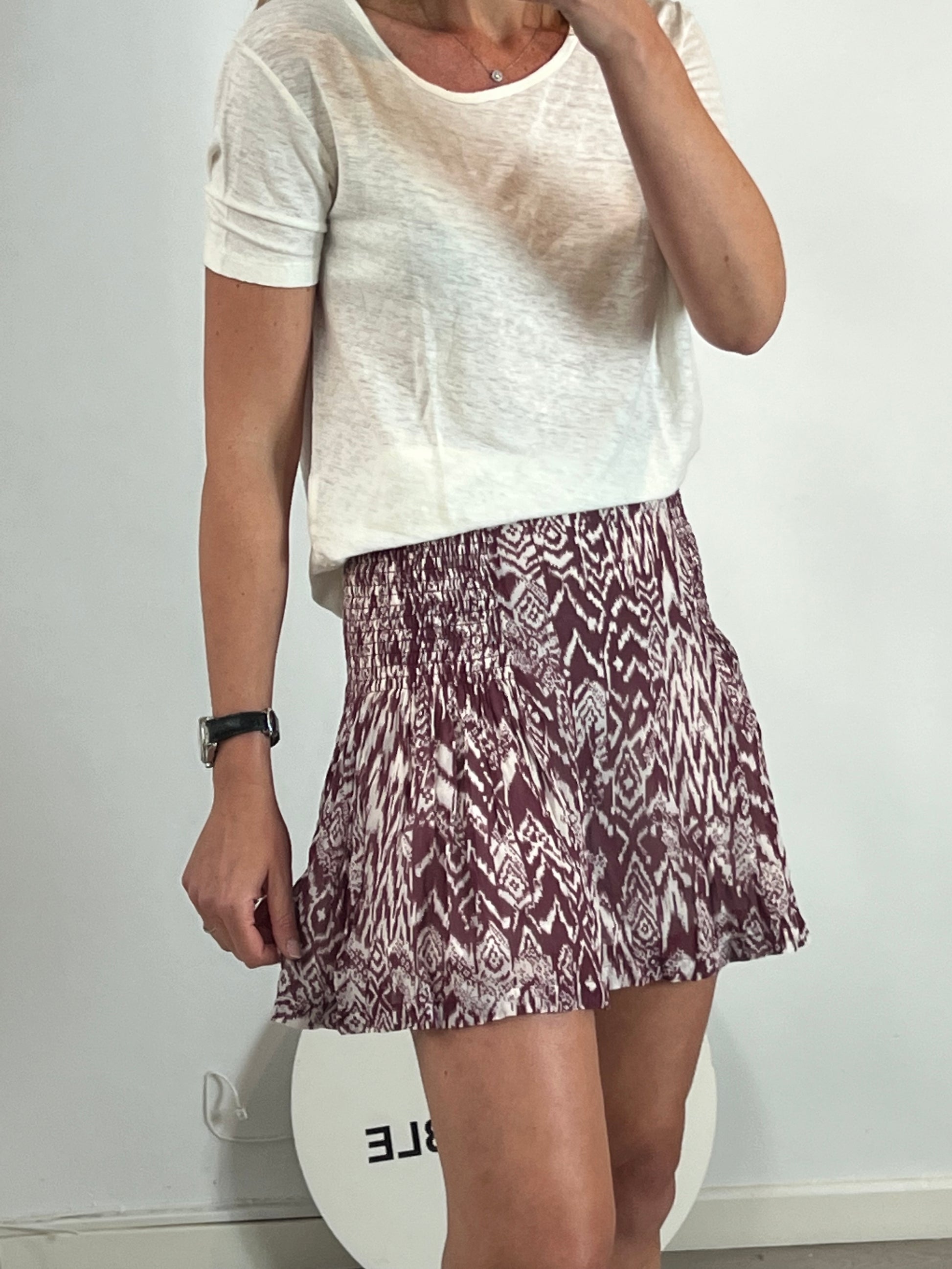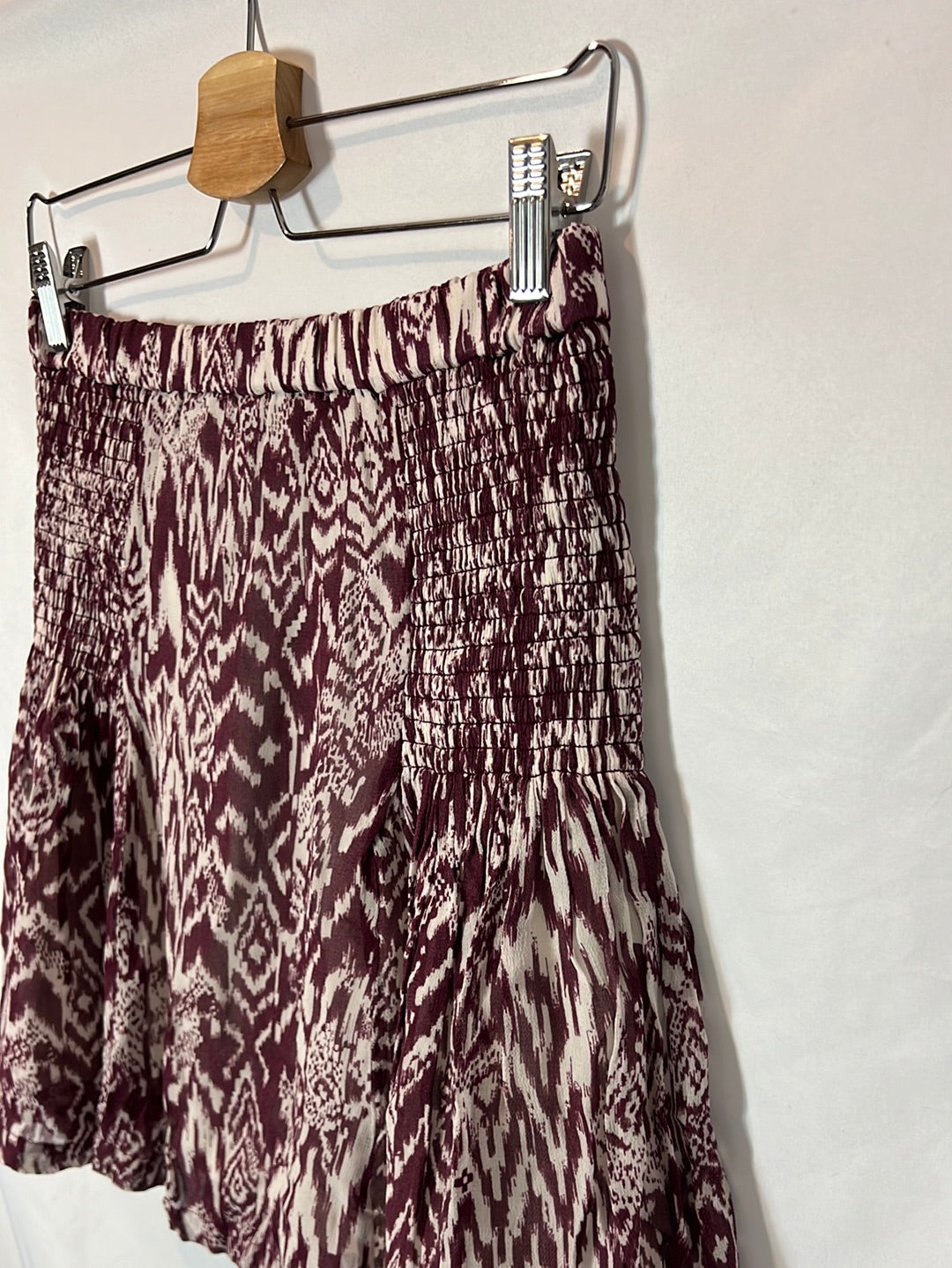 Short flowing burgundy and white printed skirt. Elastic waist. 35cm elastic waist, 44cm long.