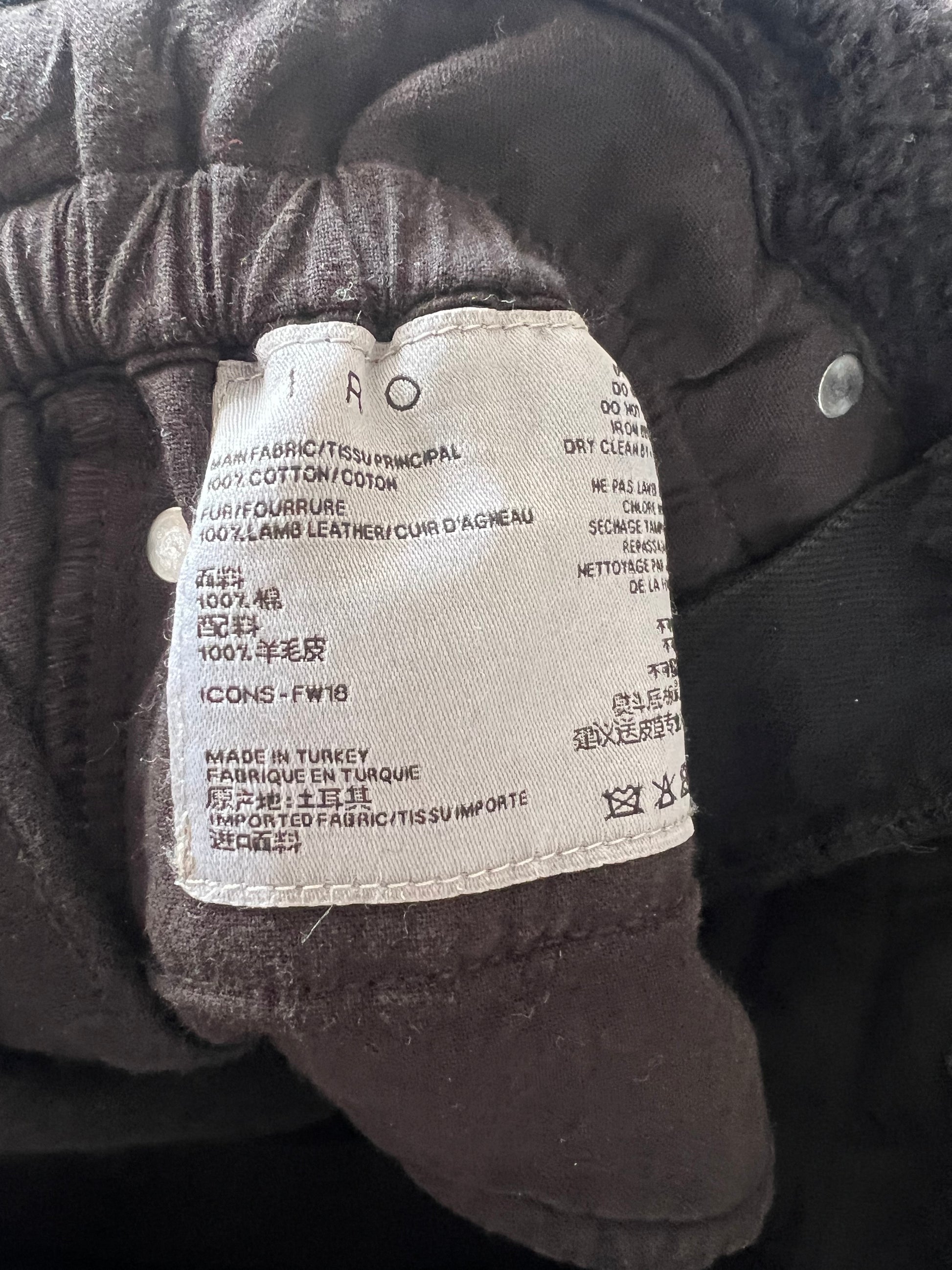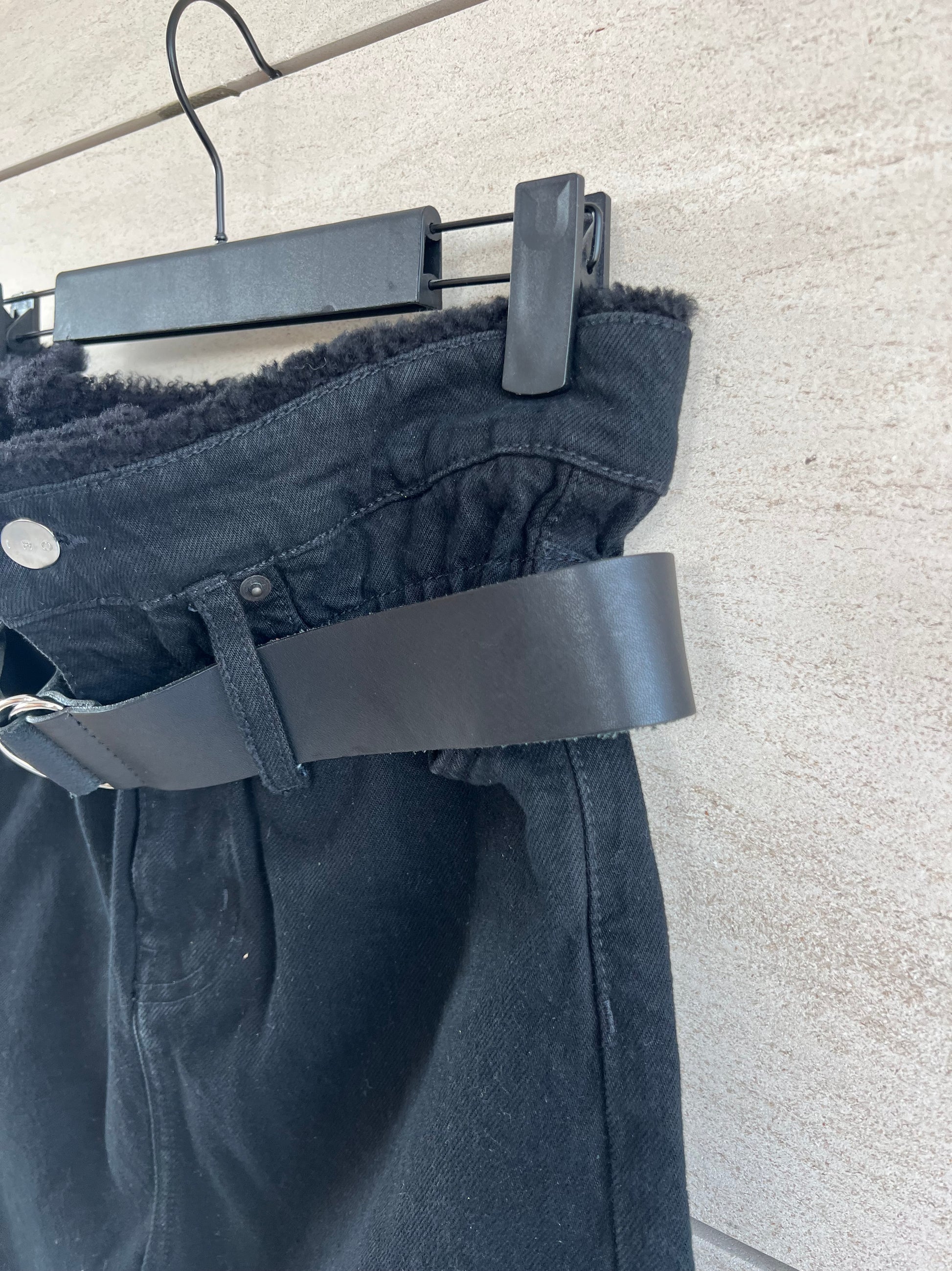 High-waisted black denim skirt with shearling interior waistband detail and leather belt. Waist 36 cm, length 43 cm.