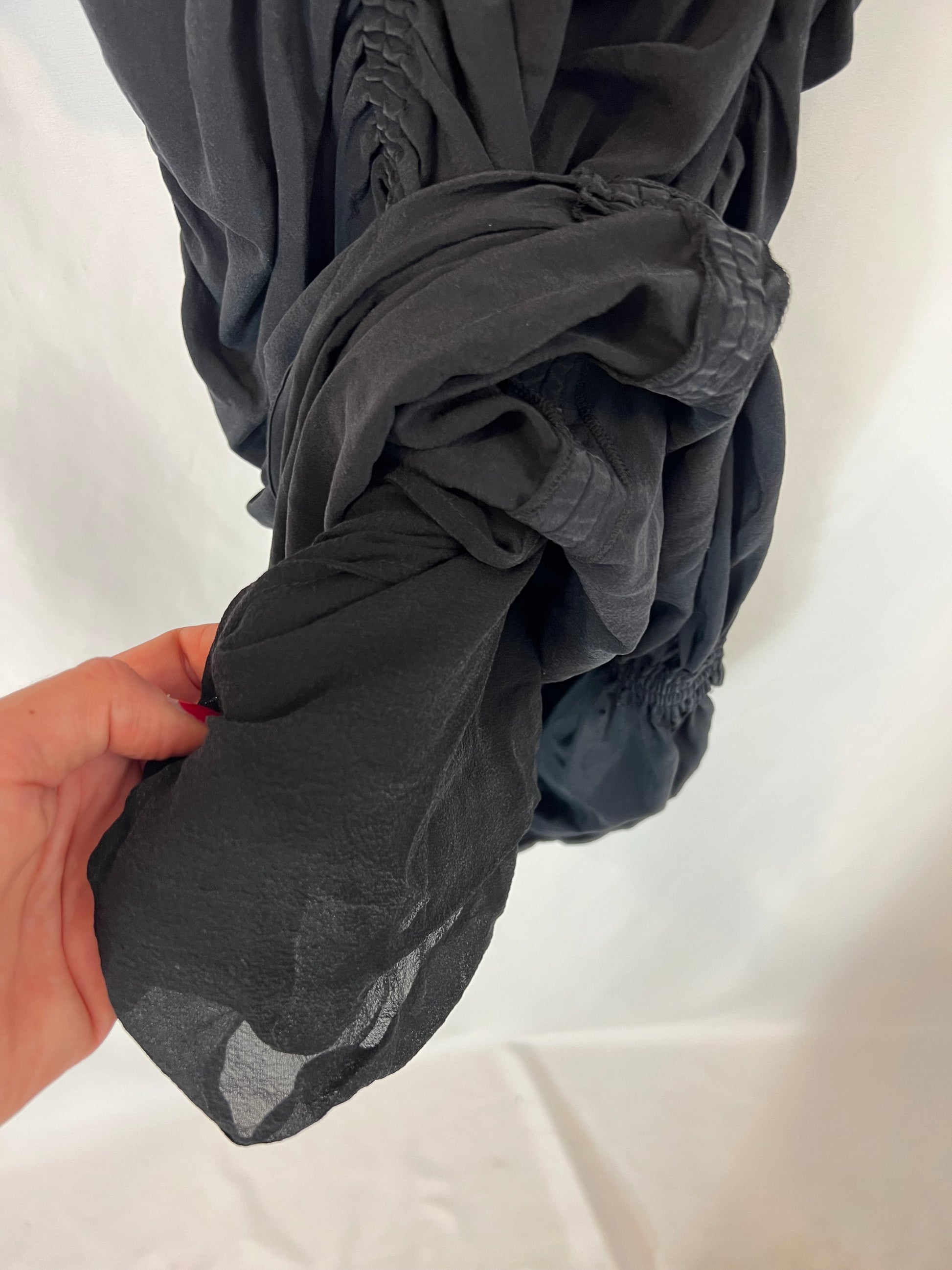 Short silk dress with gathered ruffles on the sleeves, length 91 cm, from armpit to armpit 43 cm, hip 45 cm, semi-elastic