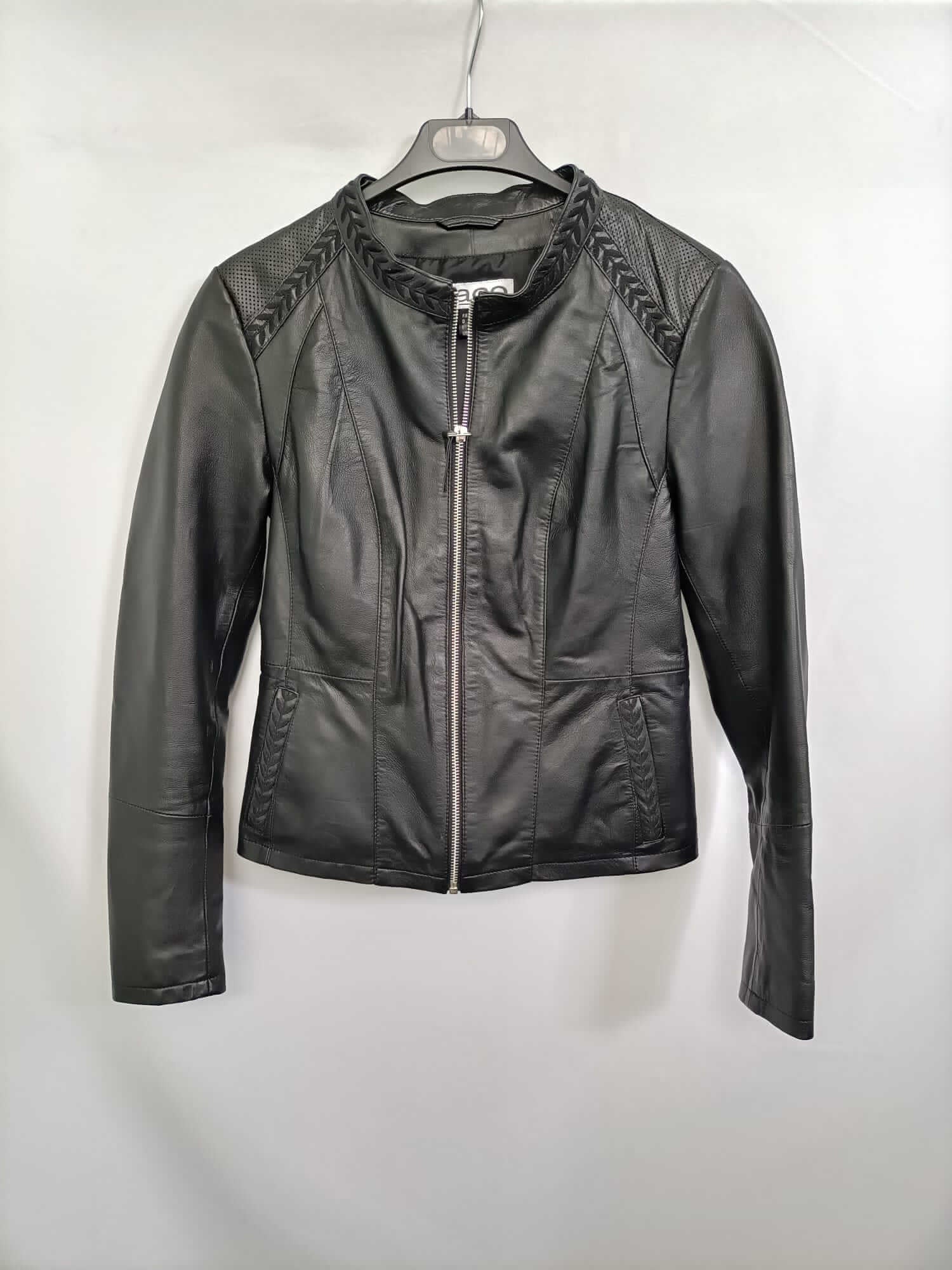 Isaco&kawa. Black leather jacket with embroidered details. It's non-stretchy and fitted. Armhole to armhole: 40 cm, length: 58 cm.