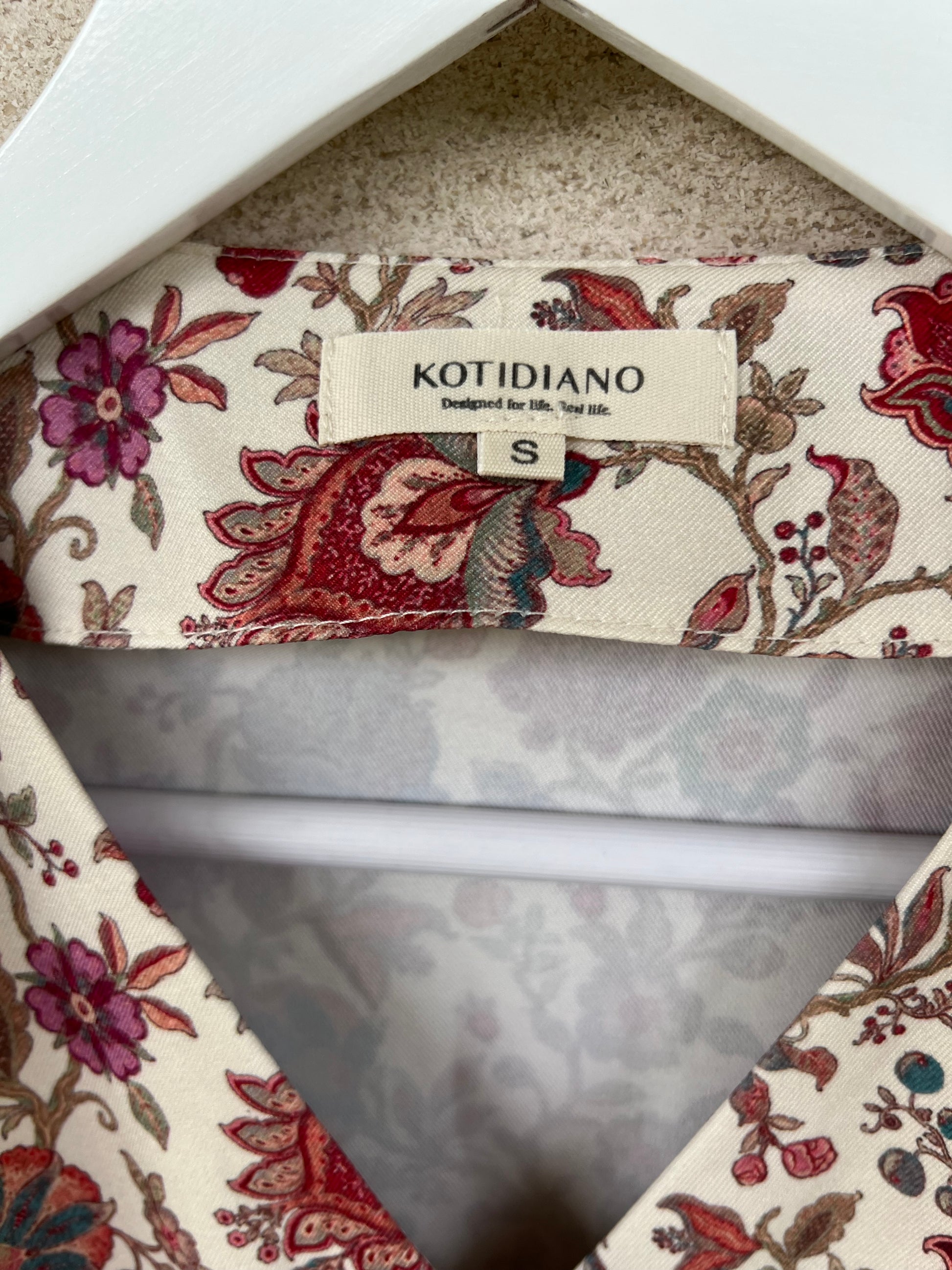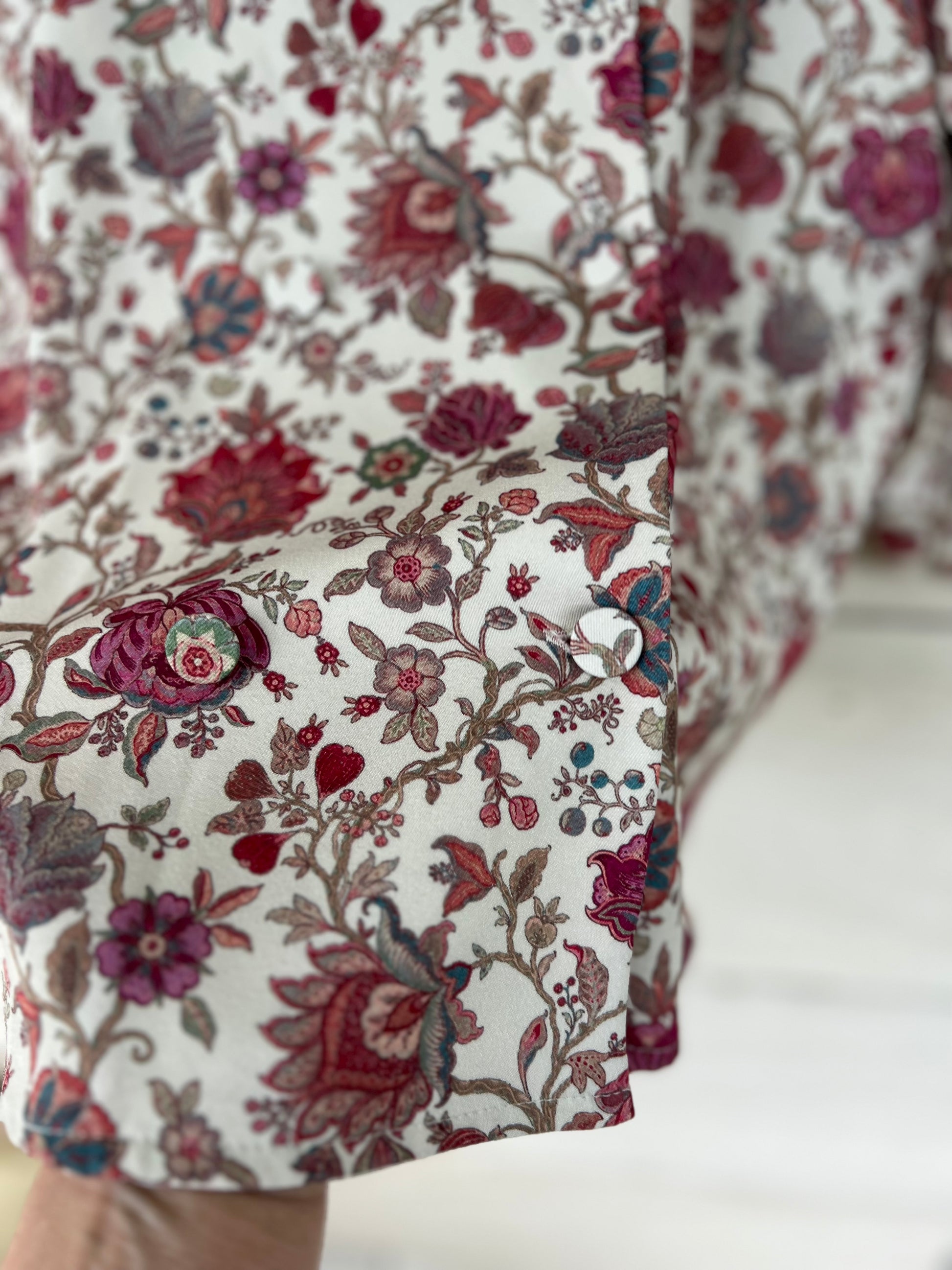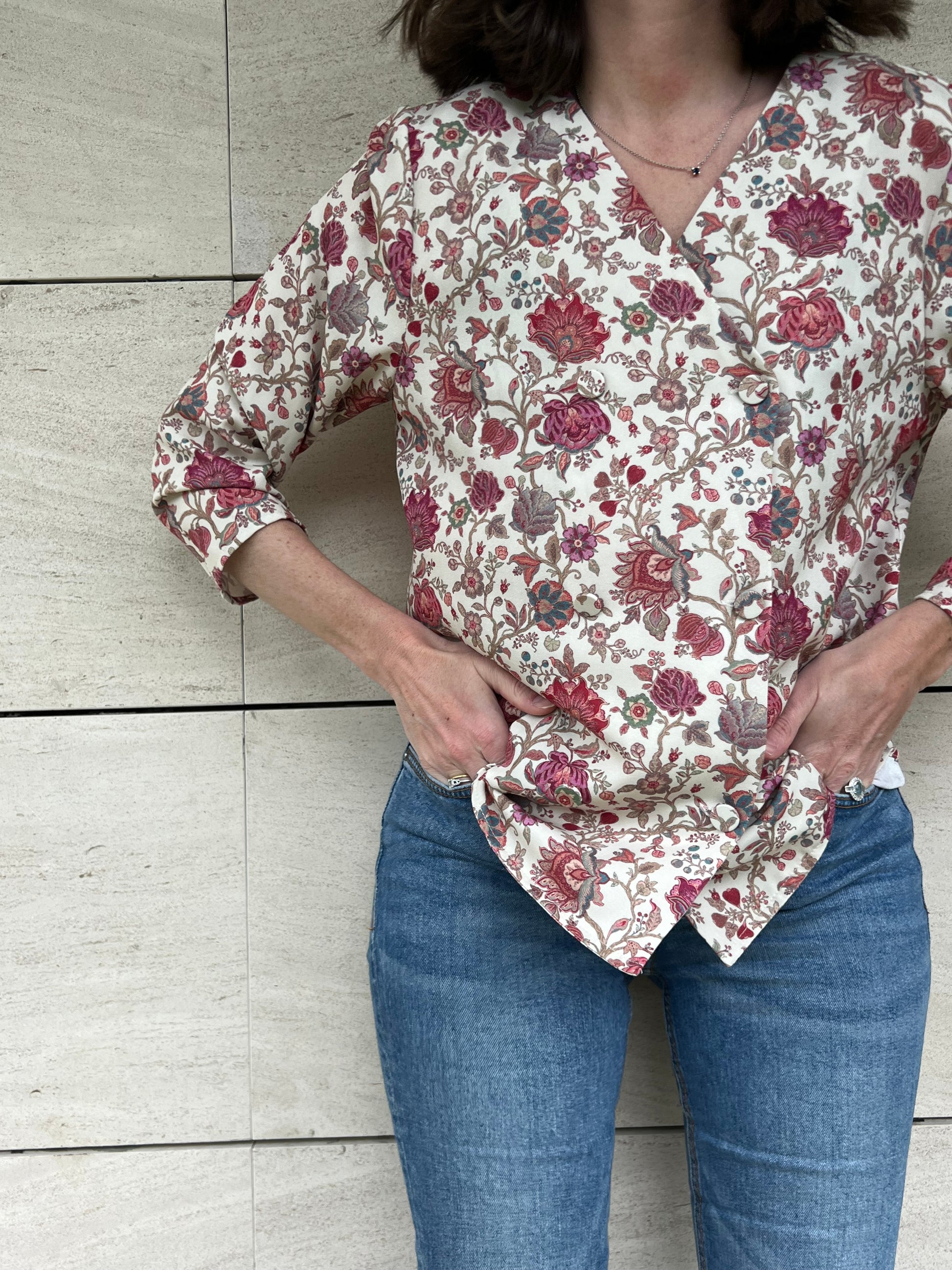 Beige floral print blouse. Wraparound. Back 50cm, length 57cm.