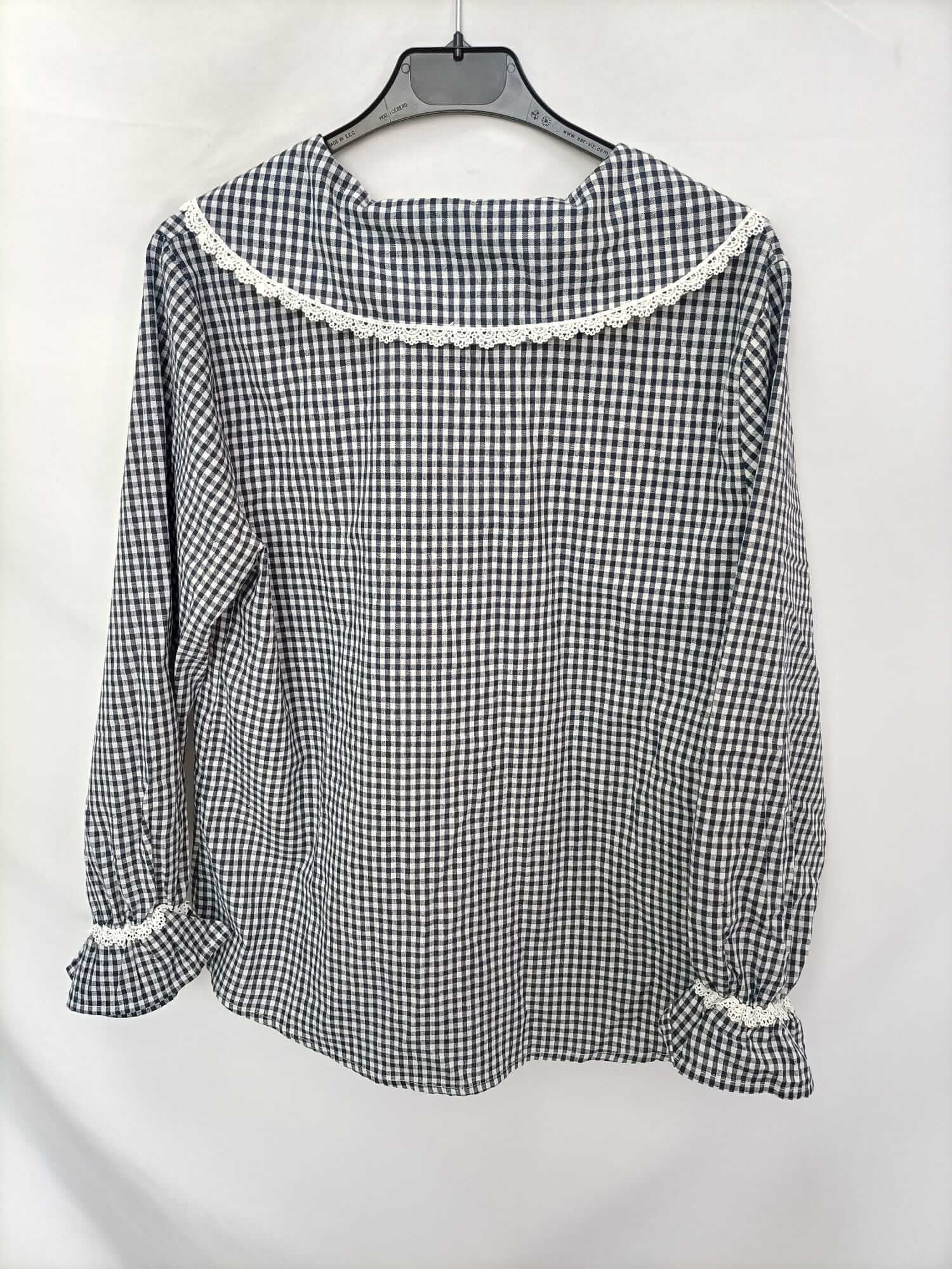 The maglietts. S. Blue and off-white gingham shirt with a baby collar and crochet detail. No stretch. Armhole to armhole 49 cm, length 66 cm.