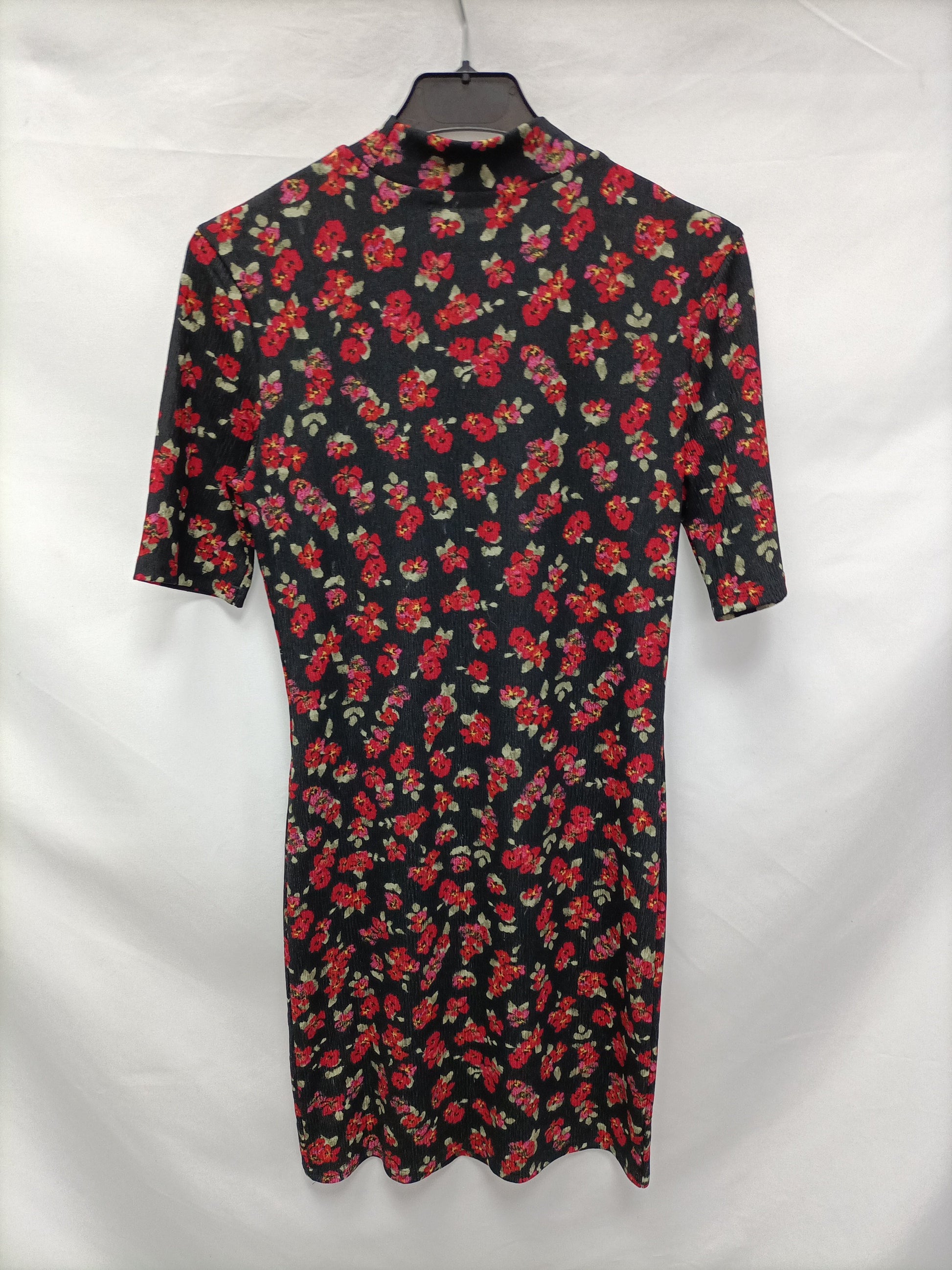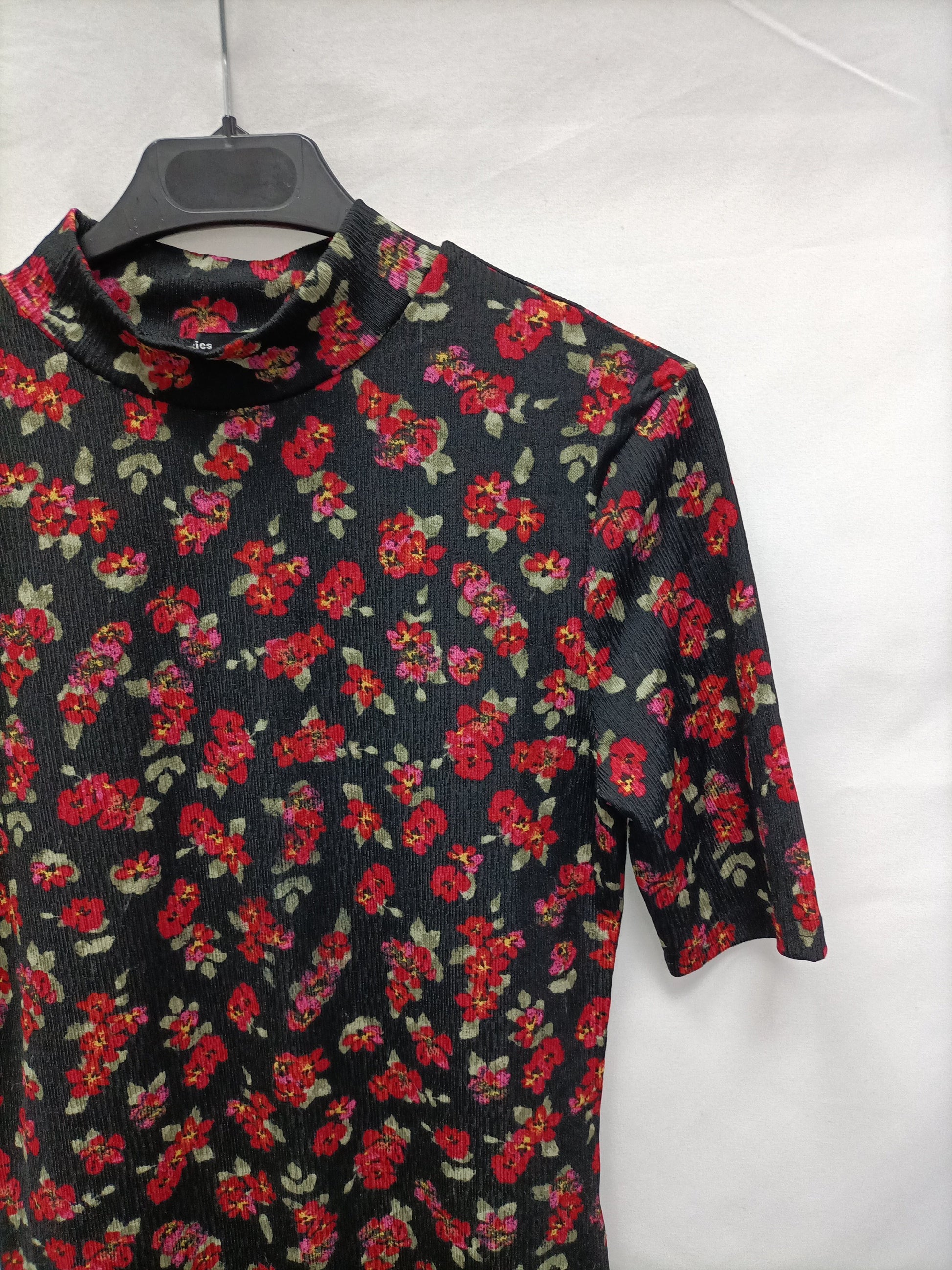 Short black dress with red flowers. Stretchy and fitted. Perkins collar. 88 cm long.