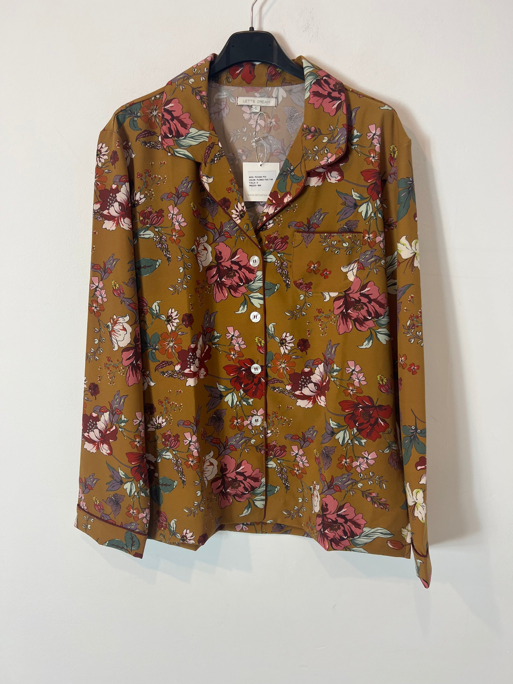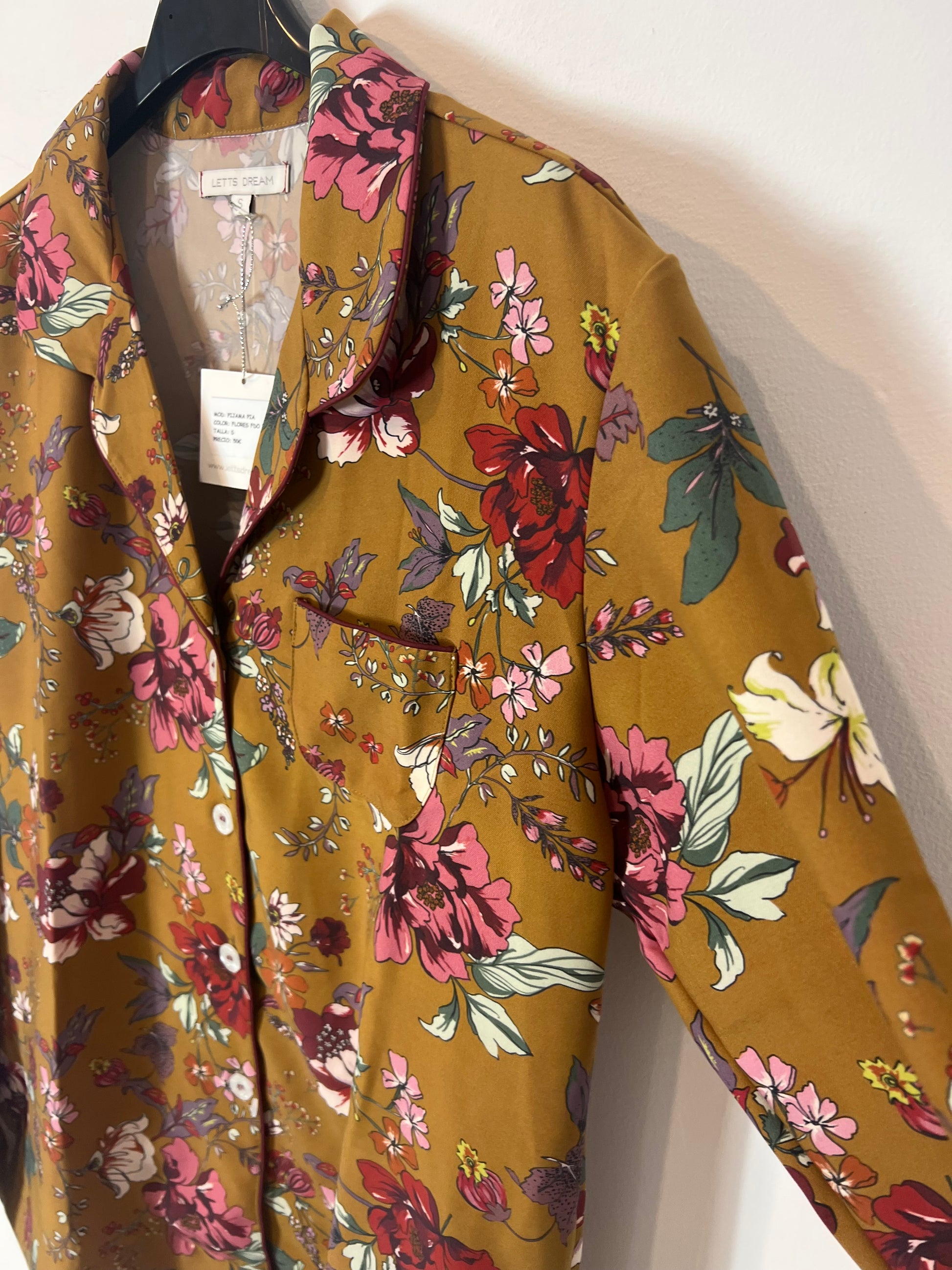 NUEVO CON ETIQUETA. Pijama dos piezas estampado con fondo mostaza. Pantalón: cintura 36cm Semi elástica, largo 93cm. Blusa: espalda 49cm, largo 65cm