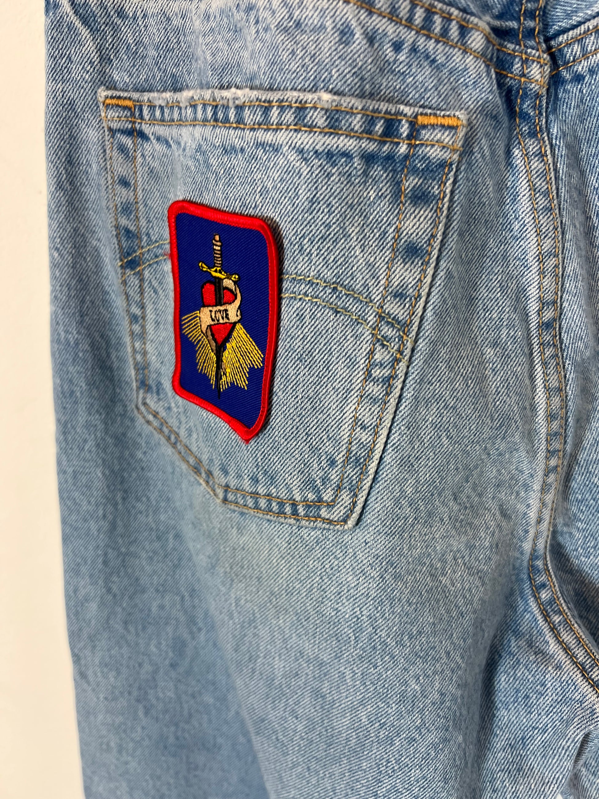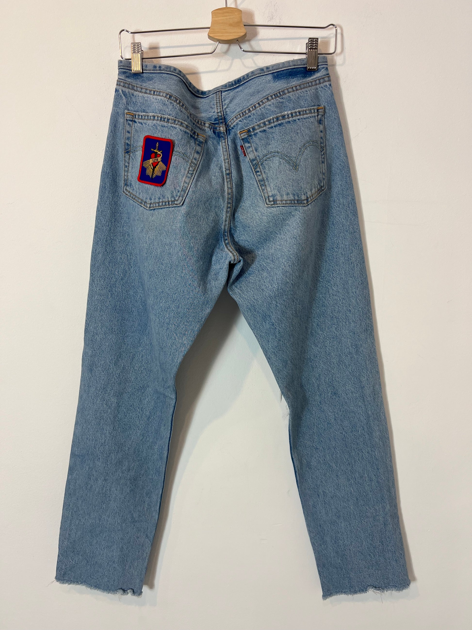 Wide-leg denim pants with holes and a low, buttoned waist. Style 501, waist 39 cm, length 101 cm.