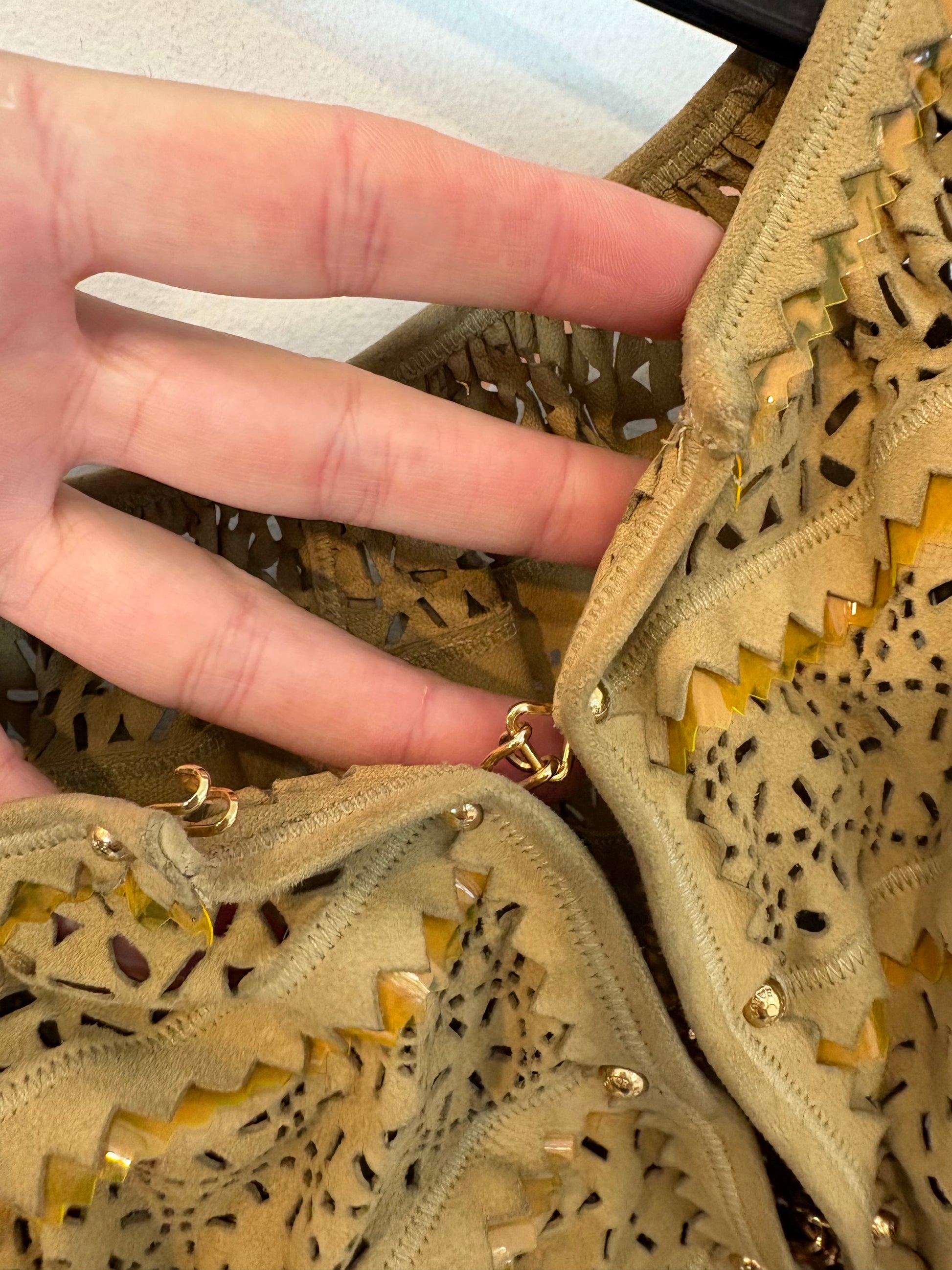 Perforated lambskin top. Back 48 cm, waist 46 cm, length 70 cm. Tare: signs of wear on the leather (photo) and missing a snap.