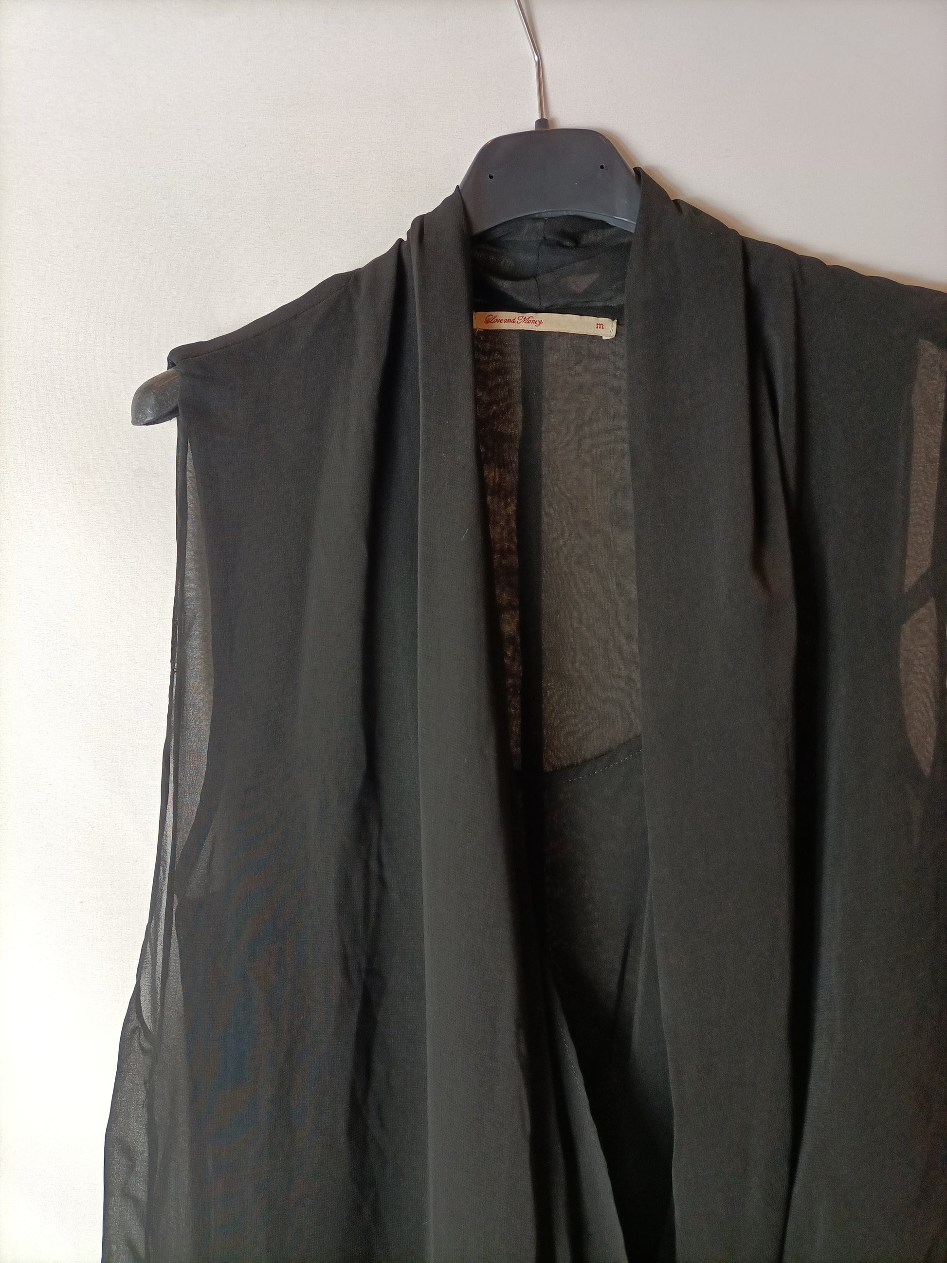 Asymmetrical, semi-sheer black top. Draped effect at the front. Non-stretch fabric.