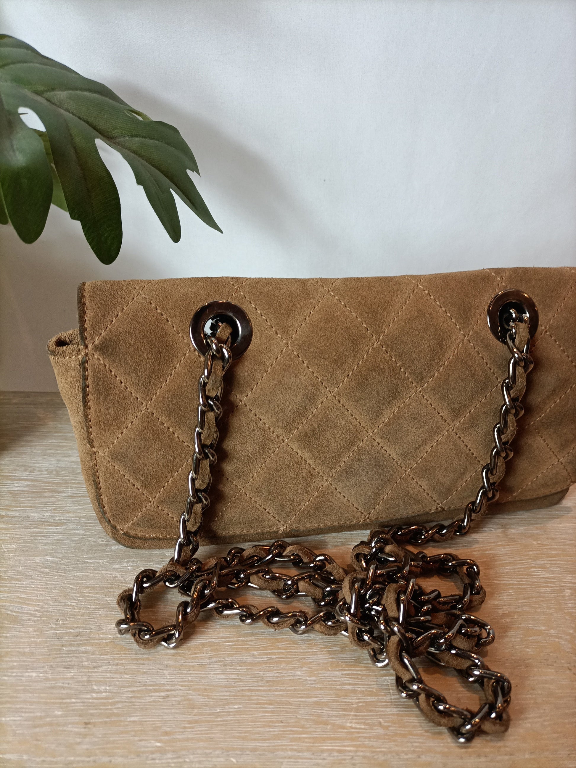 Camel bag (looks like leather) with chain handle. Tare: slightly worn exterior and some stains on the inside.
