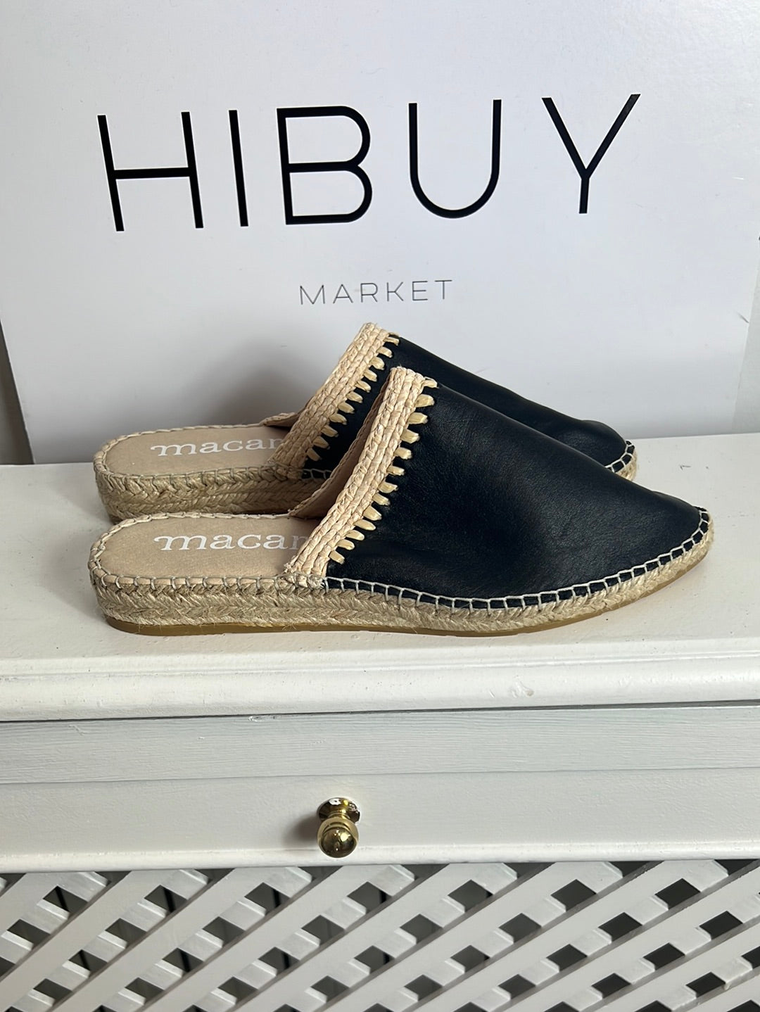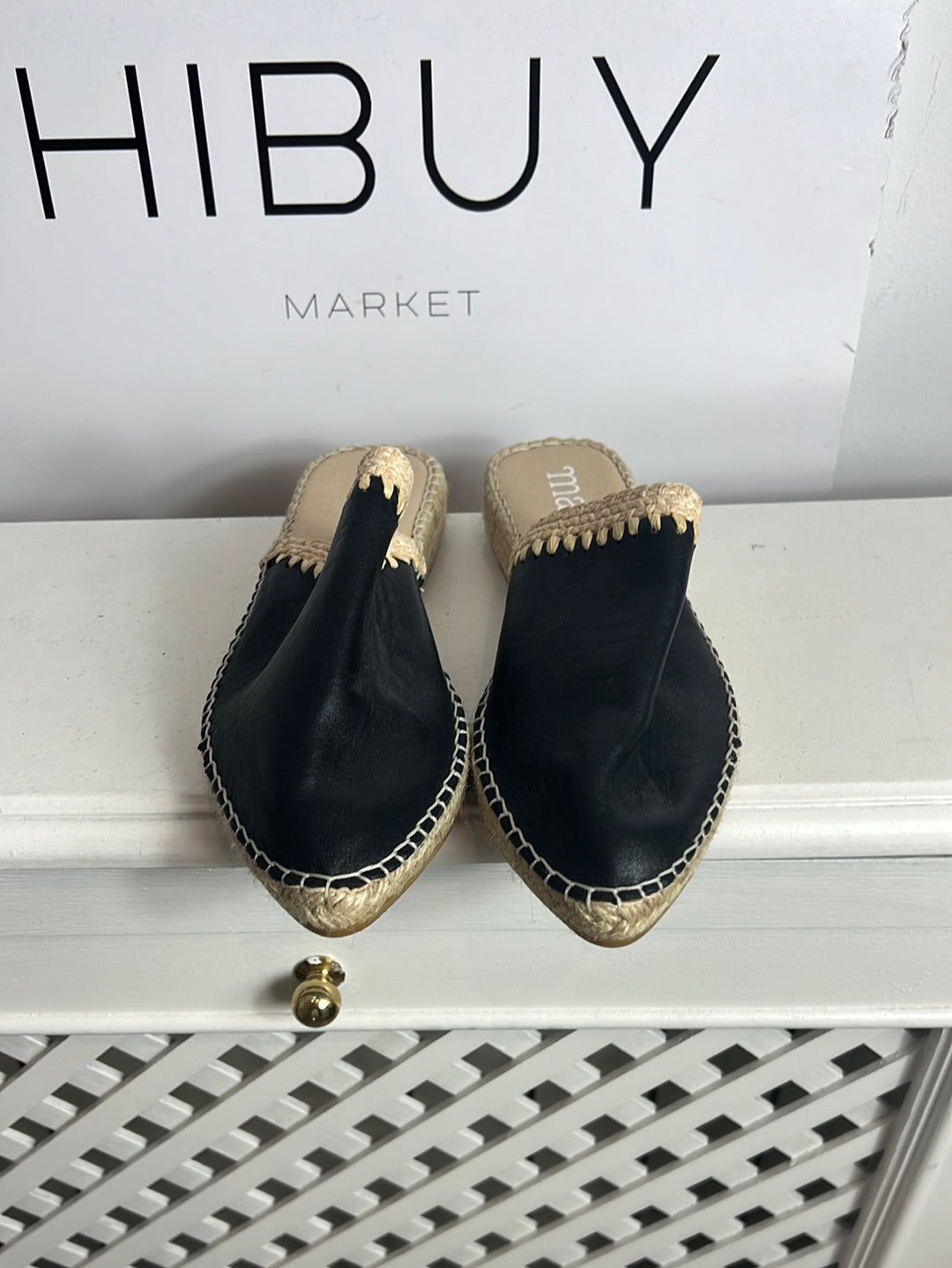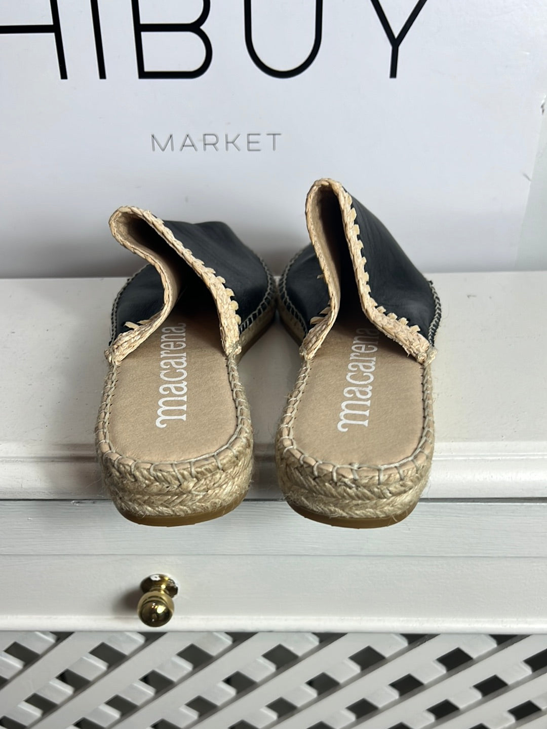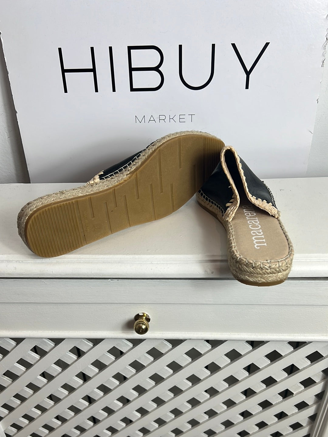 NUEVAS SIN USO. Mules negros de piel con detalles de rafia y suela de esparto