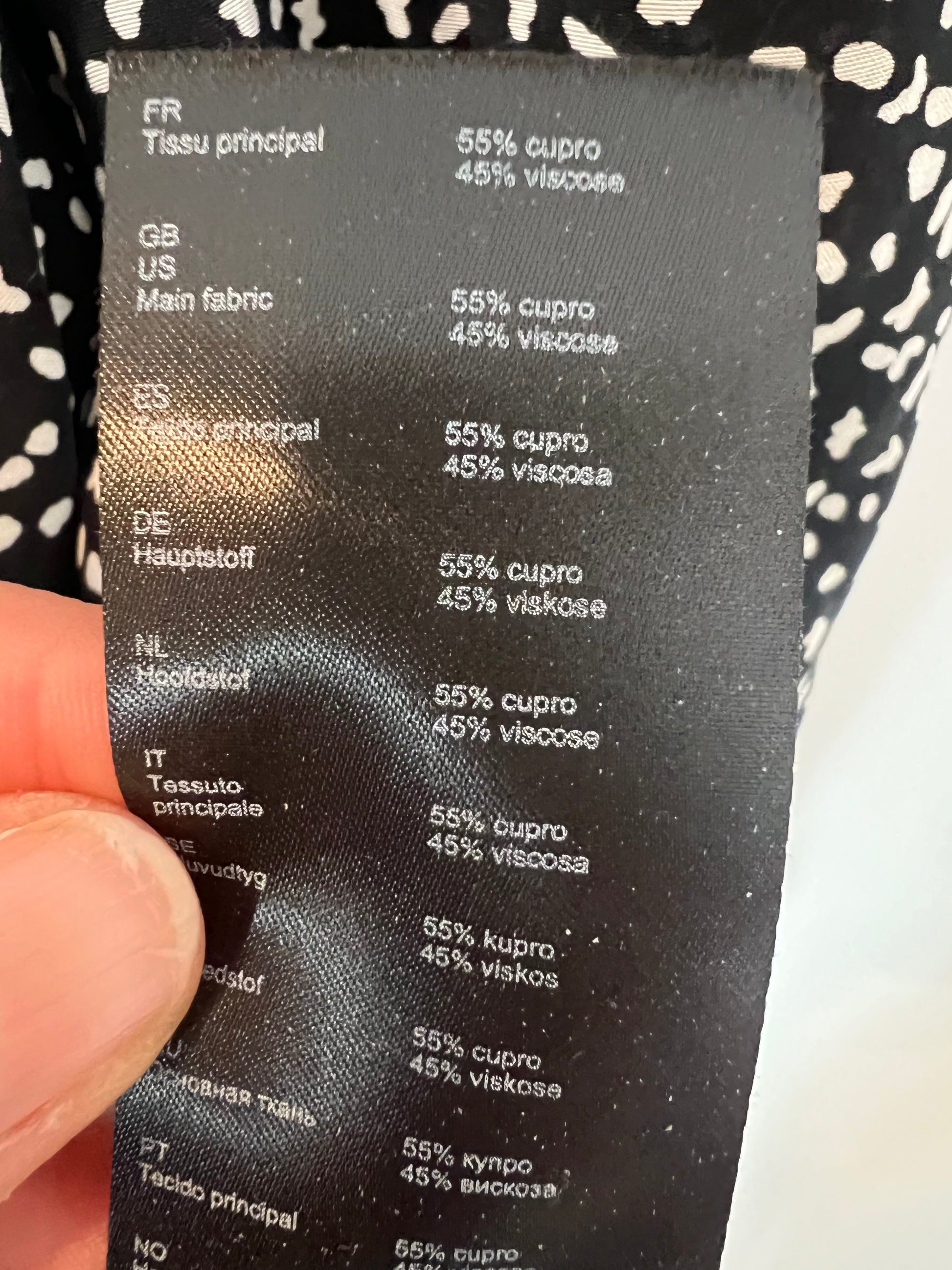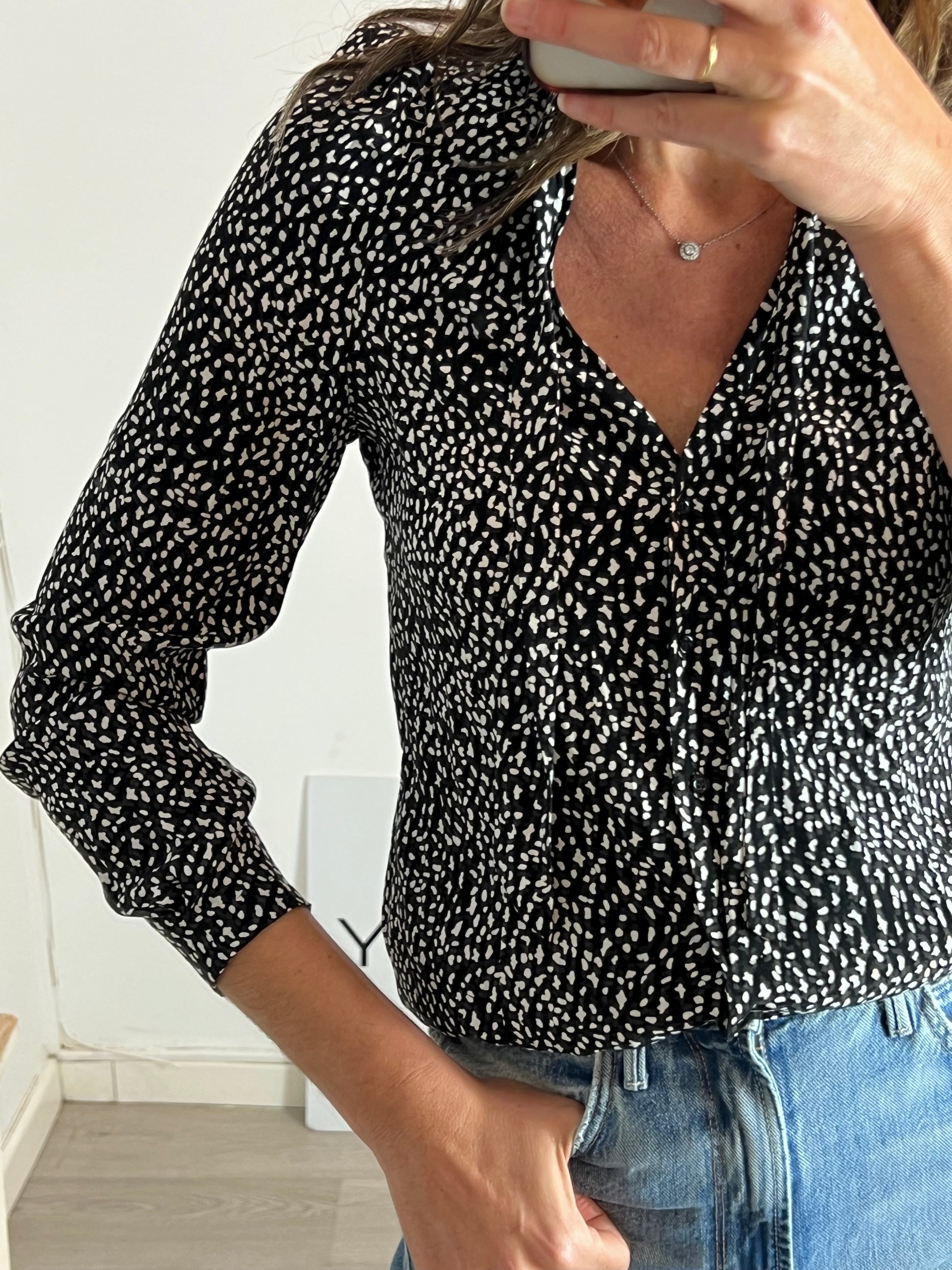 Flowy black blouse with a white print. Waist to armhole 45cm, length 64cm