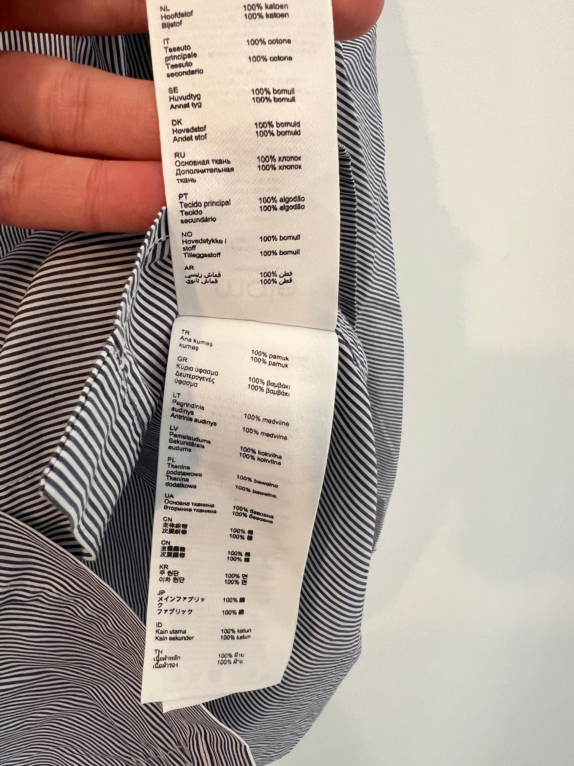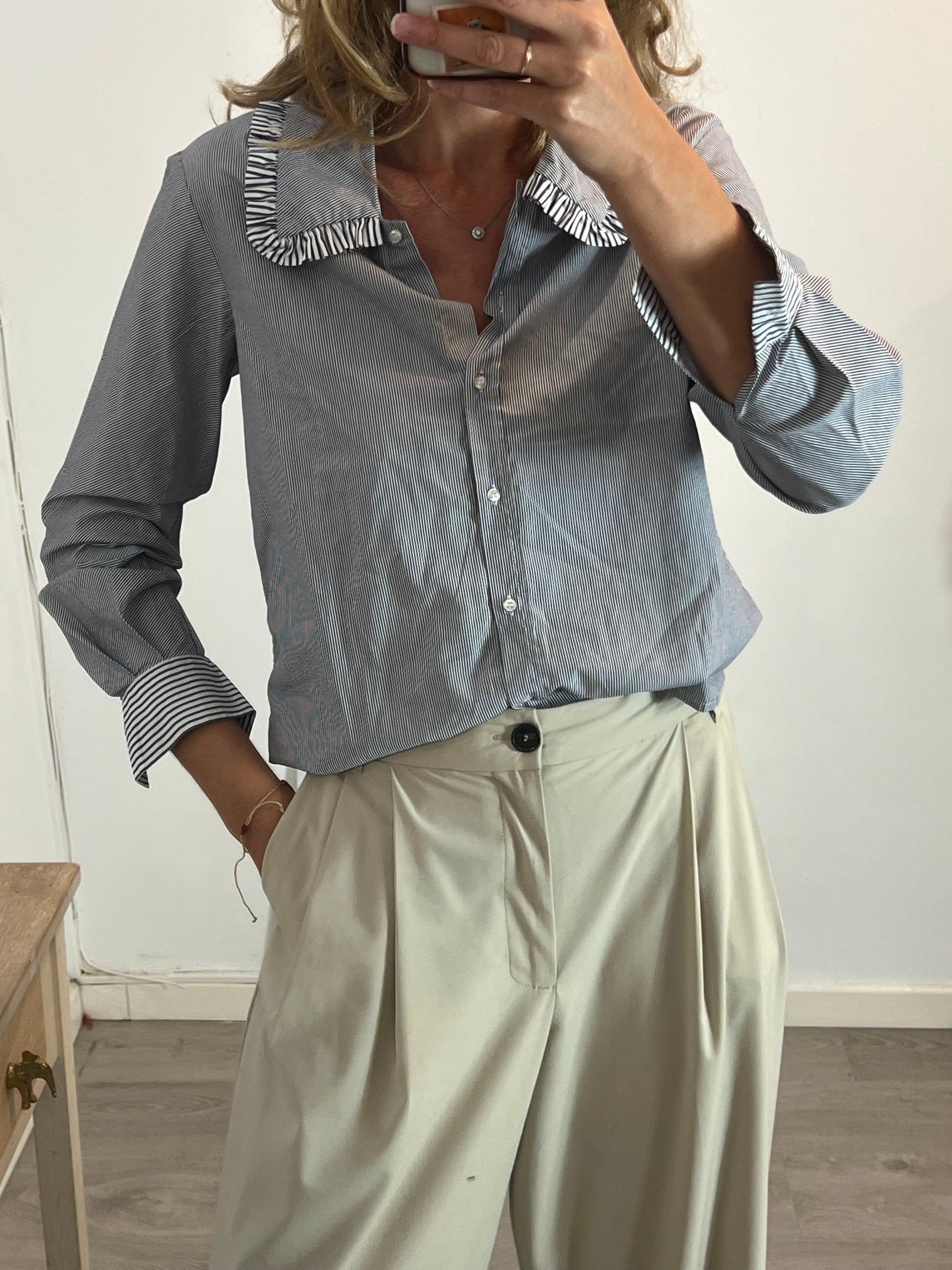 Blue striped blouse with collar detail. Non-elastic. Size 1 (S). Armpit to armpit 49 cm, length 62 cm.