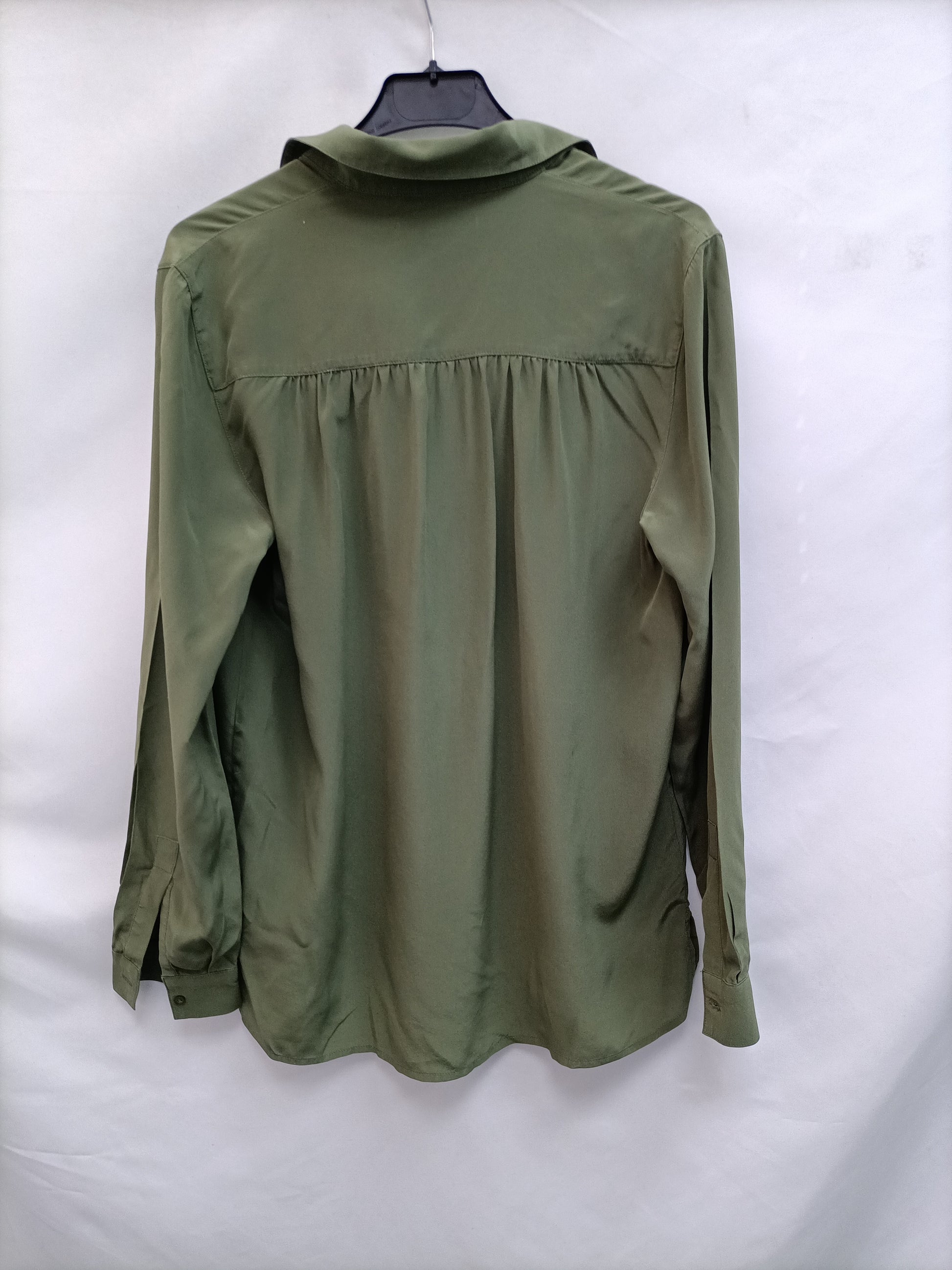 Flowy green blouse with buttons halfway down the sleeves. No stretch. 53 cm from armhole to armhole and 75 cm long . Looks like silk, but the label is cut off.