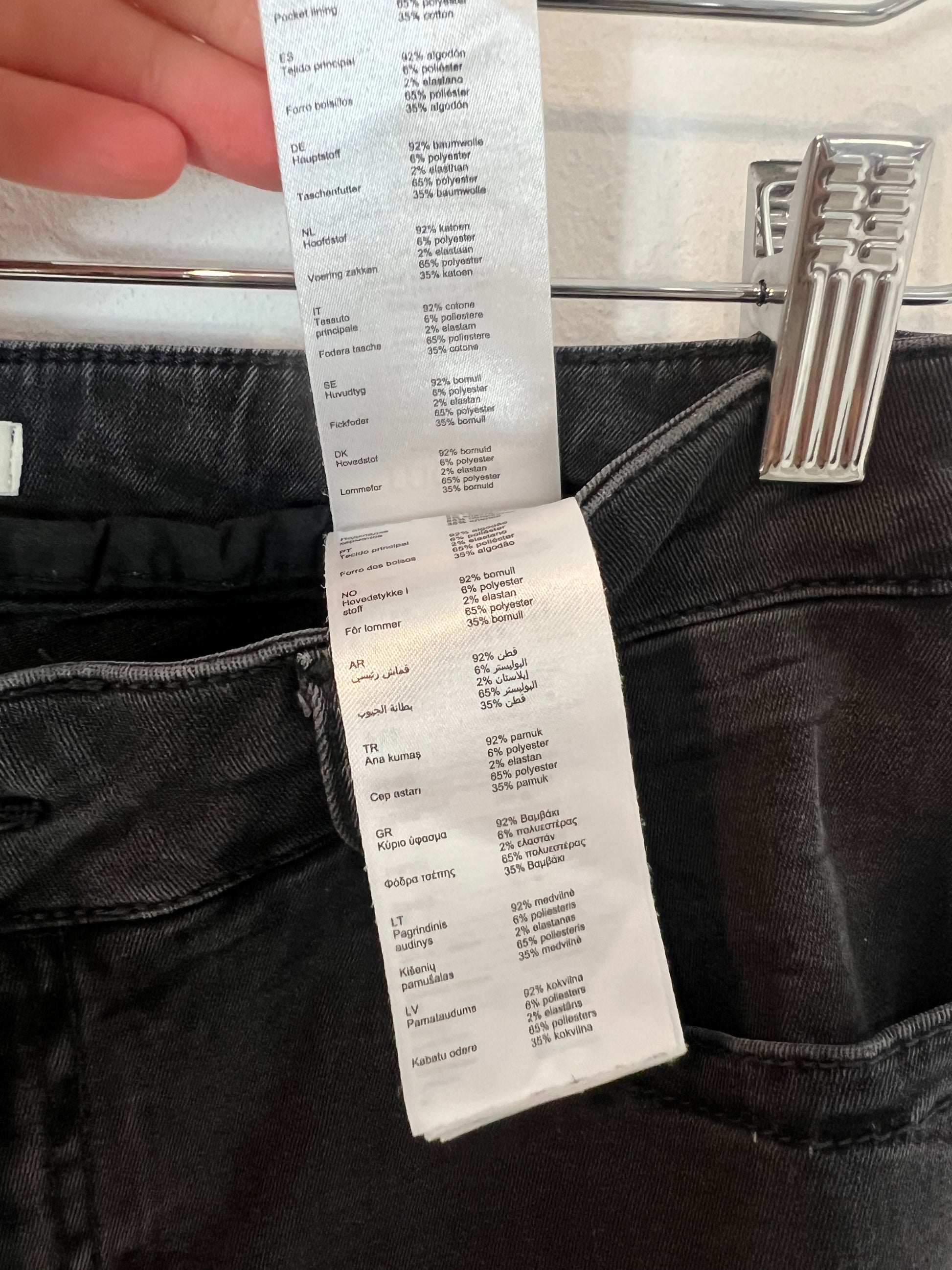Denim pitillo negro elástico desflecado. Cibtura 36cm, largo 97cm