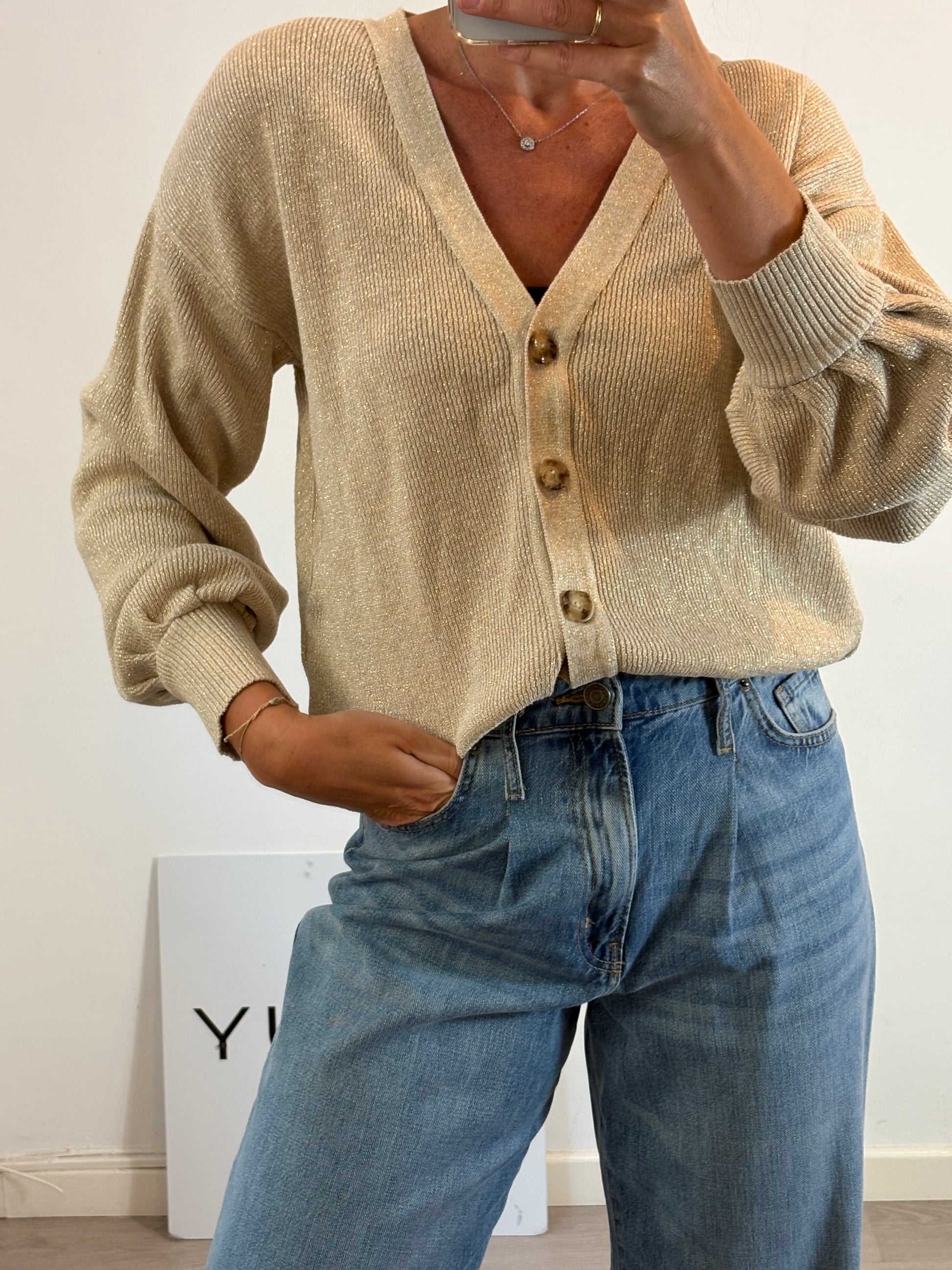 Gold-stitched button-down jacket. Back 52 cm, length 59 cm.