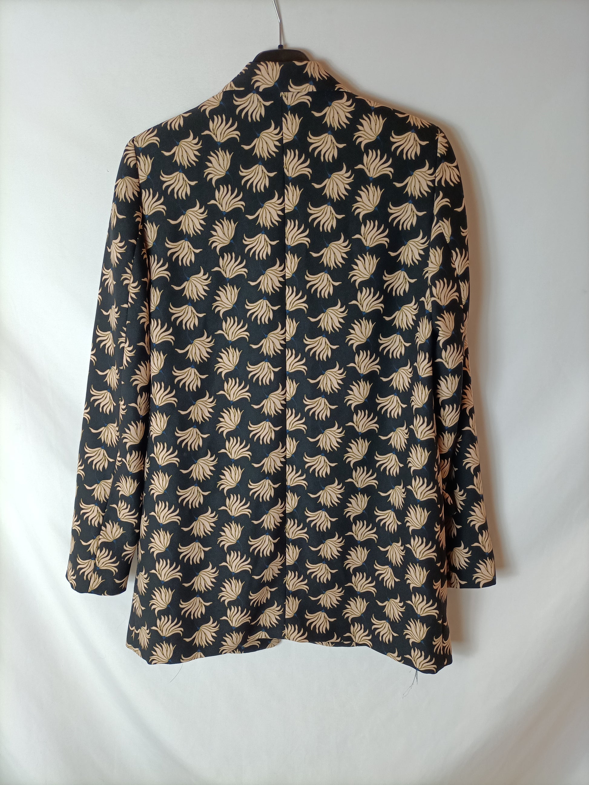 Long black blazer with a beige leaf print. Tare: torn lining. It's not visible at first glance because of the crease.
