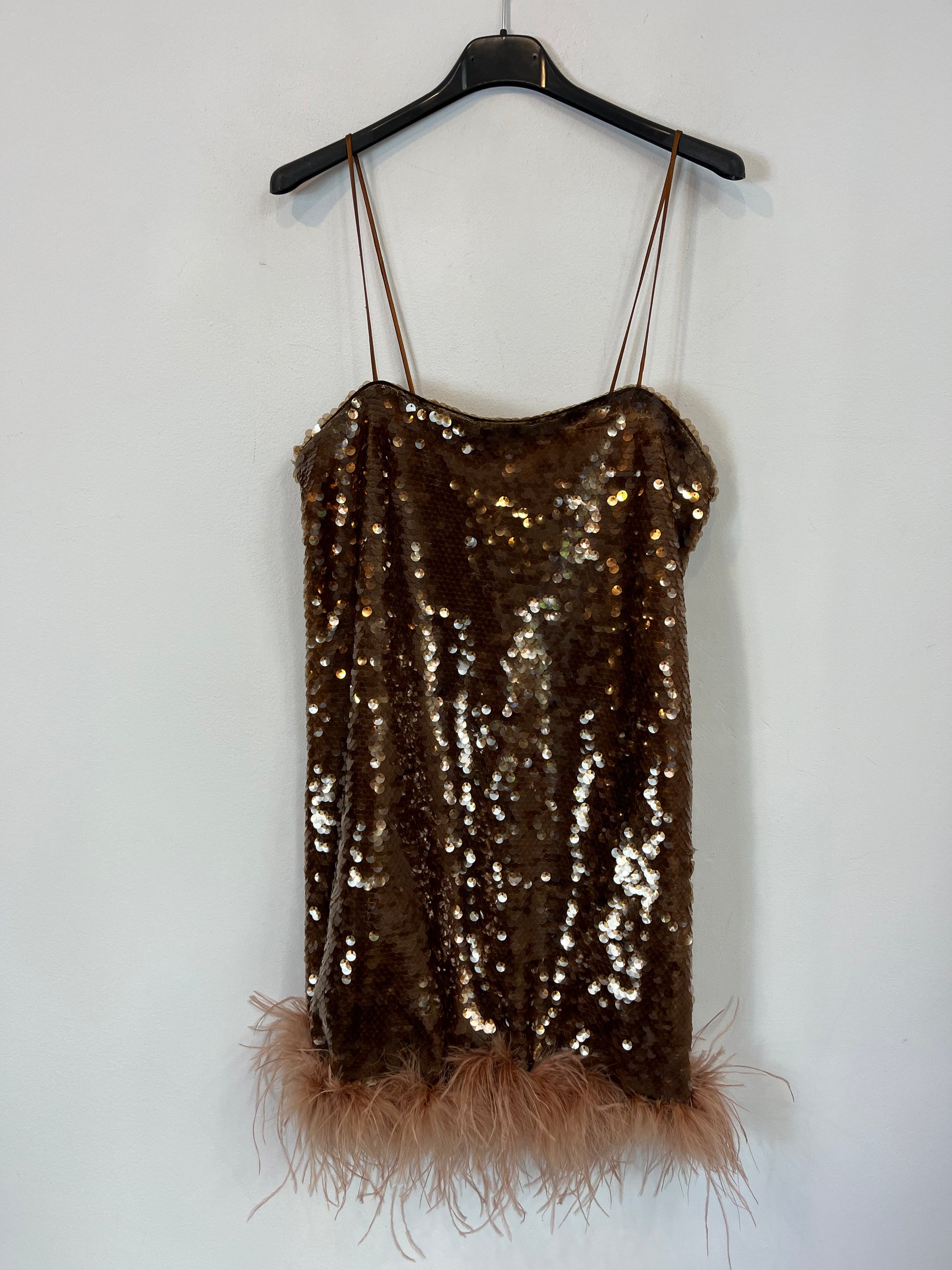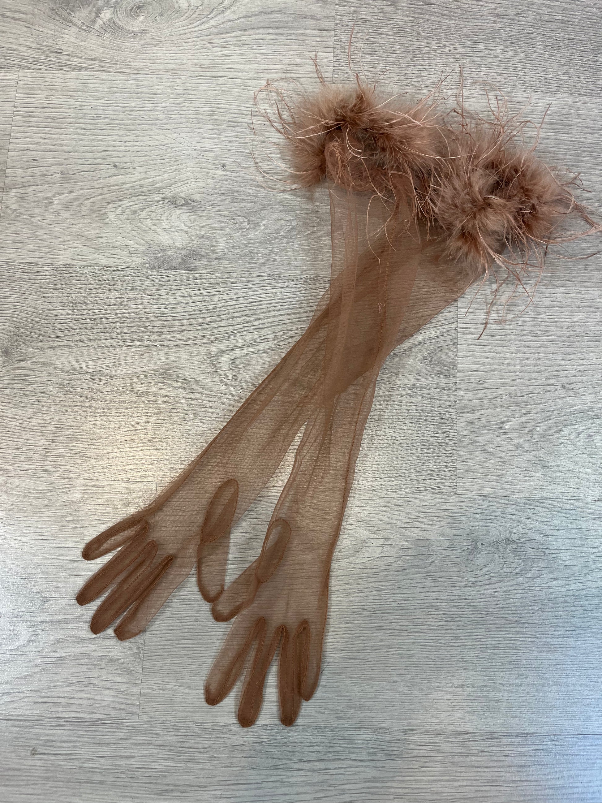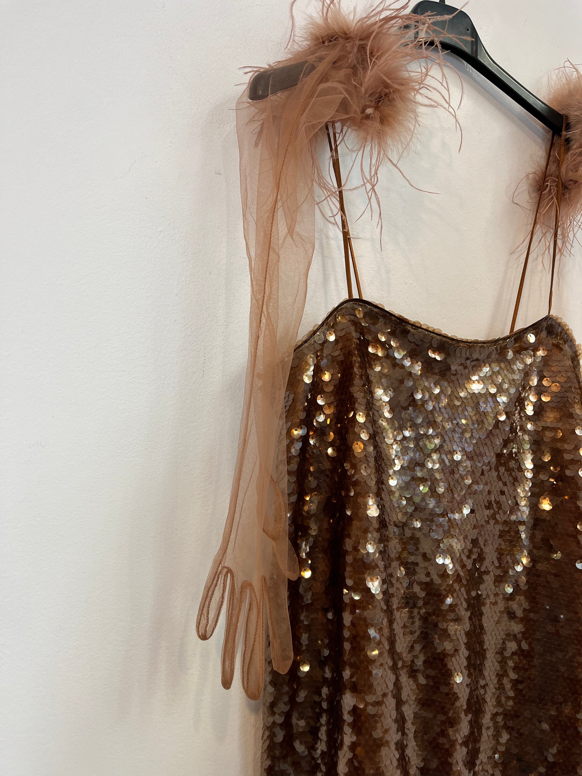 Short brown sequin dress with feather detail. Feathered fishnet glove set.