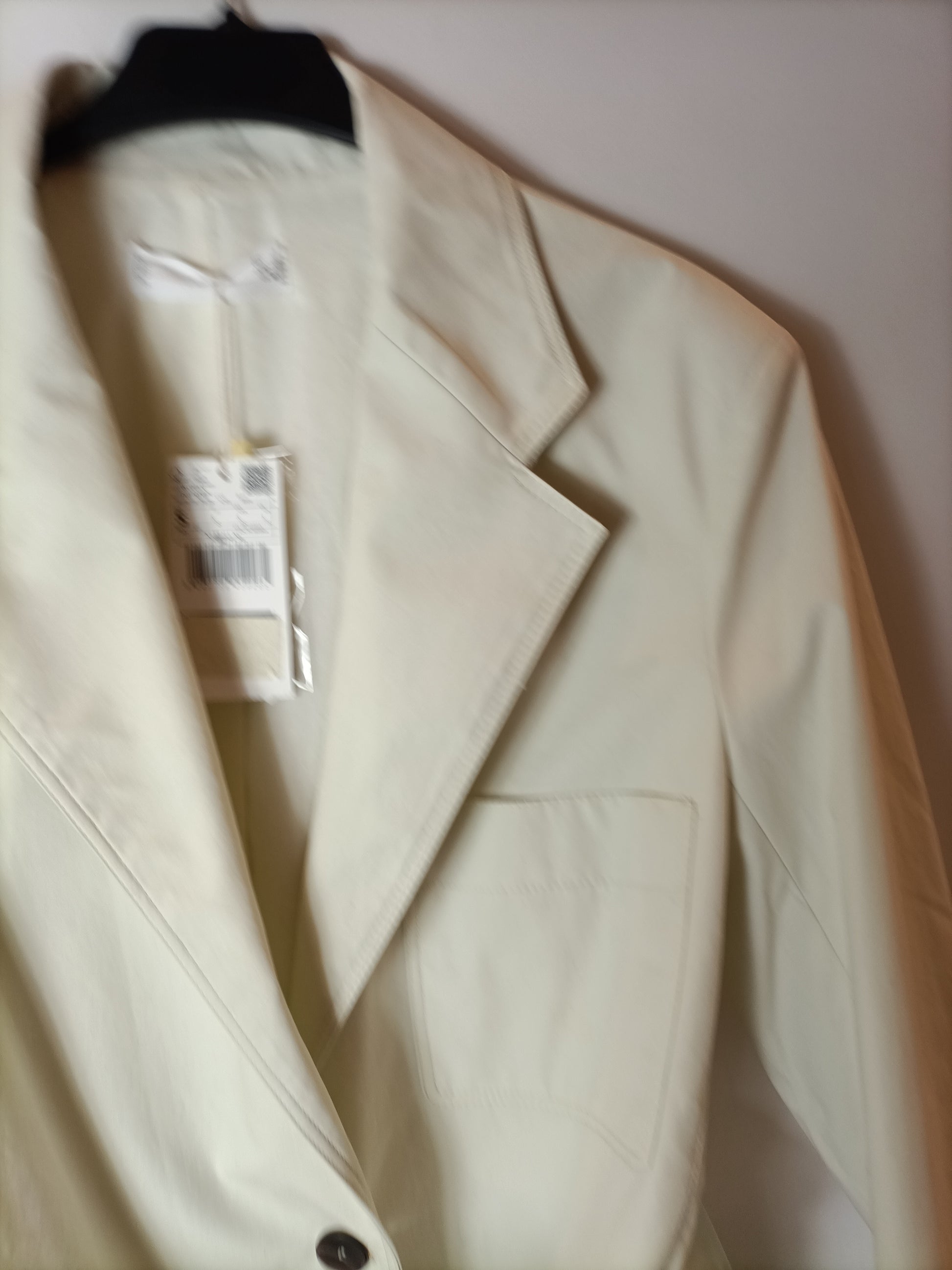 NEW WITH TAG. Beige button-down jacket with a tie belt. Armhole to armhole cm.