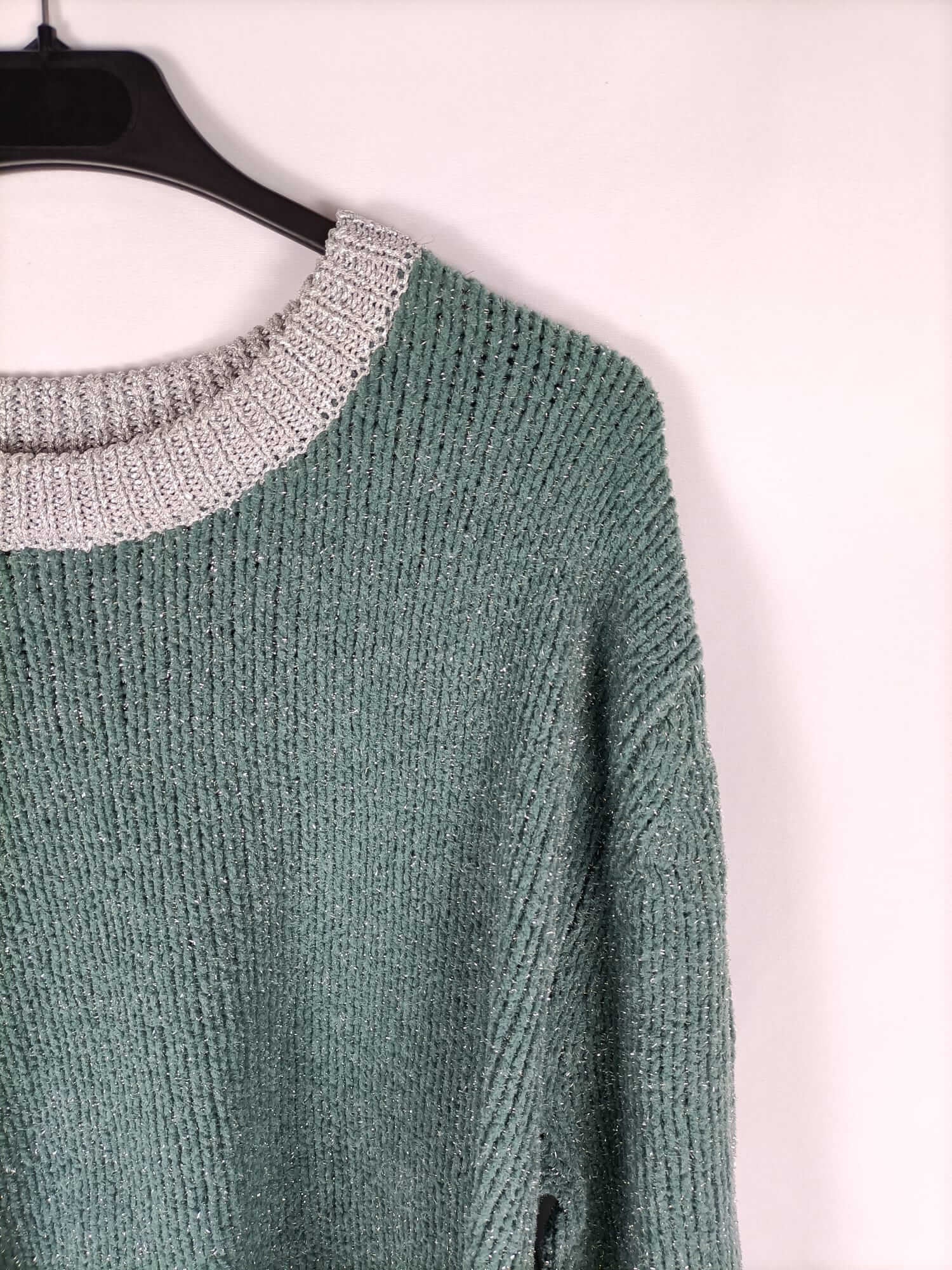 Mango. Loose-fitting grey-green sweater with silver thread detailing. Elastic. 59 cm long.