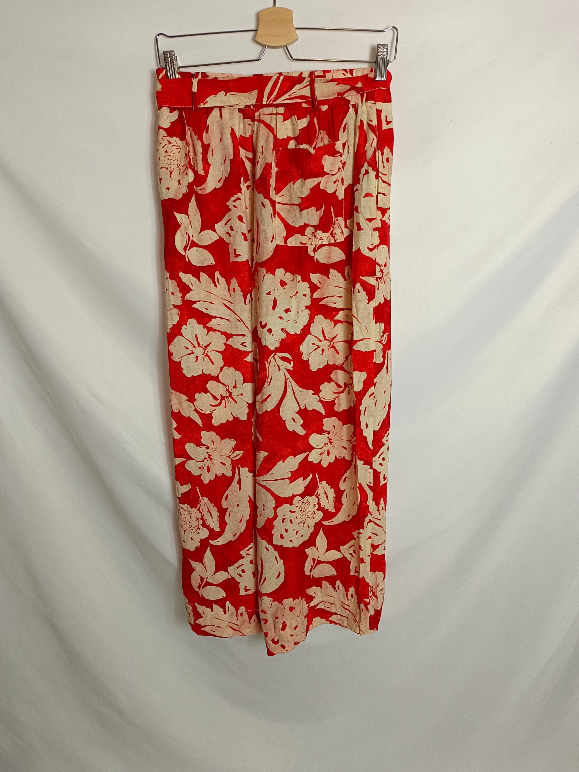 NEW WITH TAG. Flowy orange wide-leg trousers with floral print, non-stretch, and a tie belt.